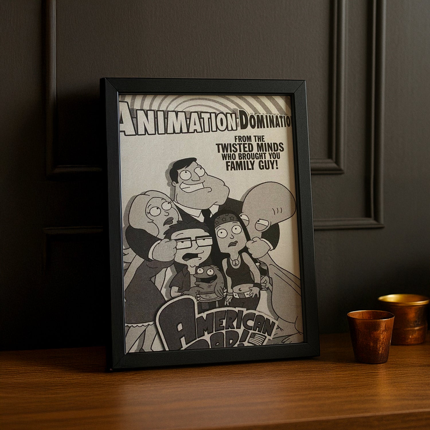 Dominez votre décoration avec ce cadre photo American Dad célébrant l'Animation Domination ! Rendez hommage à la légendaire soirée télévisée qui a fait la gloire de la série avec un cadre qui règne en maître sur vos murs. Parfait pour les fans inconditionnels qui se souviennent de chaque dimanche soir passé devant l'écran, cette pièce capture l'esprit conquérant de l'animation culte. Affirmez votre domination en tant que vrai fan et laissez ce cadre proclamer votre dévouement avec style et humour. Un incontournable pour transformer votre espace en véritable empire de comédie animée !