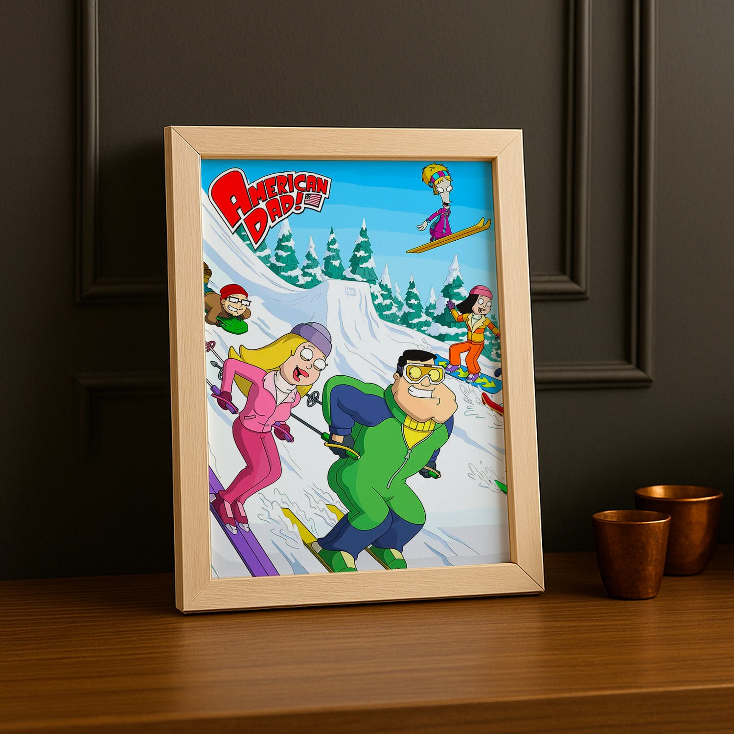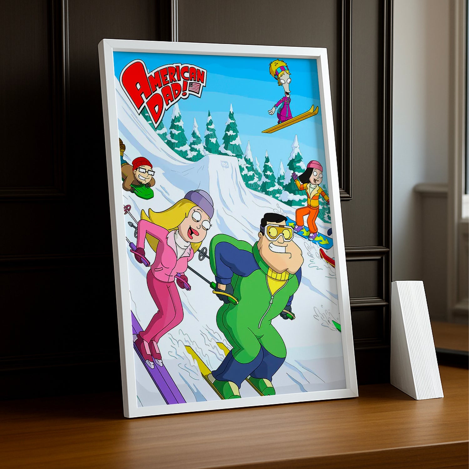 Dévaler les pentes avec style grâce à ce cadre photo American Dad sur le thème du ski ! Capturez l'énergie hilarante de vos scènes de glisse préférées de la série dans ce cadre original. Parfait pour les fans qui adorent mélanger leur passion pour les sports d'hiver et leur amour pour American Dad, cette pièce apporte une dose de fun à votre décoration. Que ce soit pour immortaliser vos propres aventures enneigées ou simplement pour afficher votre dévouement à la série, ce cadre est le compagnon idéal. Accrochez-le et laissez la bonne humeur dégringoler !