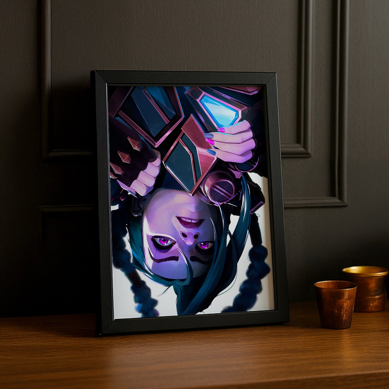 Avec ses cheveux bleus flottants et son expression pleine de mystère, cette composition renversée symbolise son voyage tumultueux entre innocence et rébellion. Ce cadre photo est un véritable hommage à l’univers d’Arcane et à l’art qui donne vie à ses personnages inoubliables.
