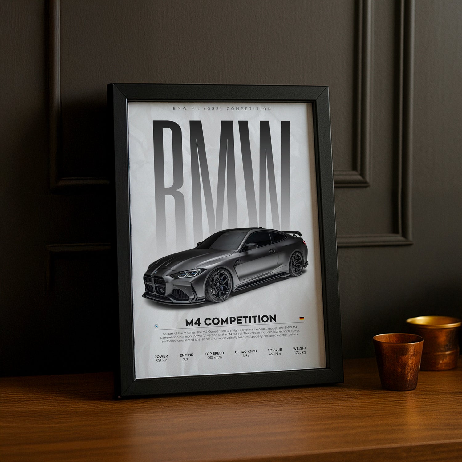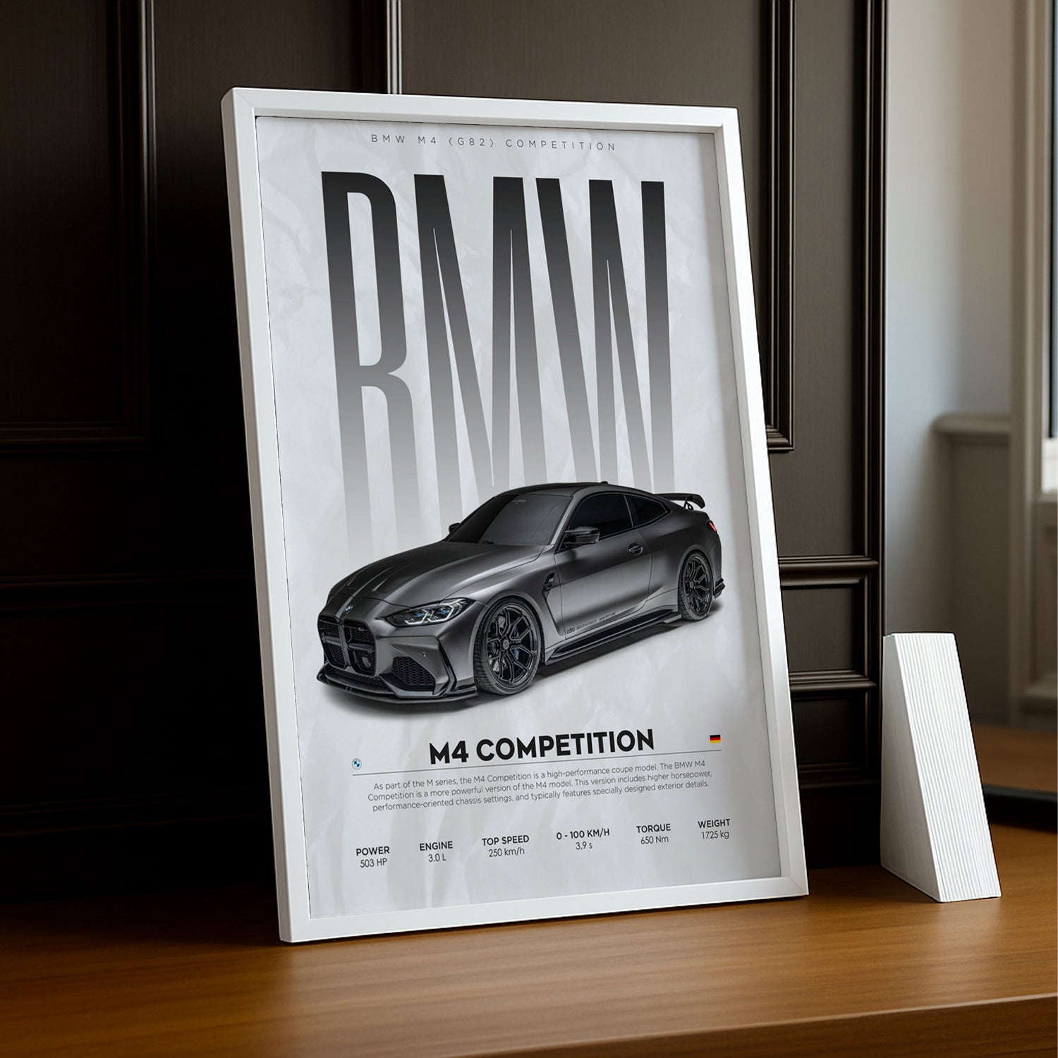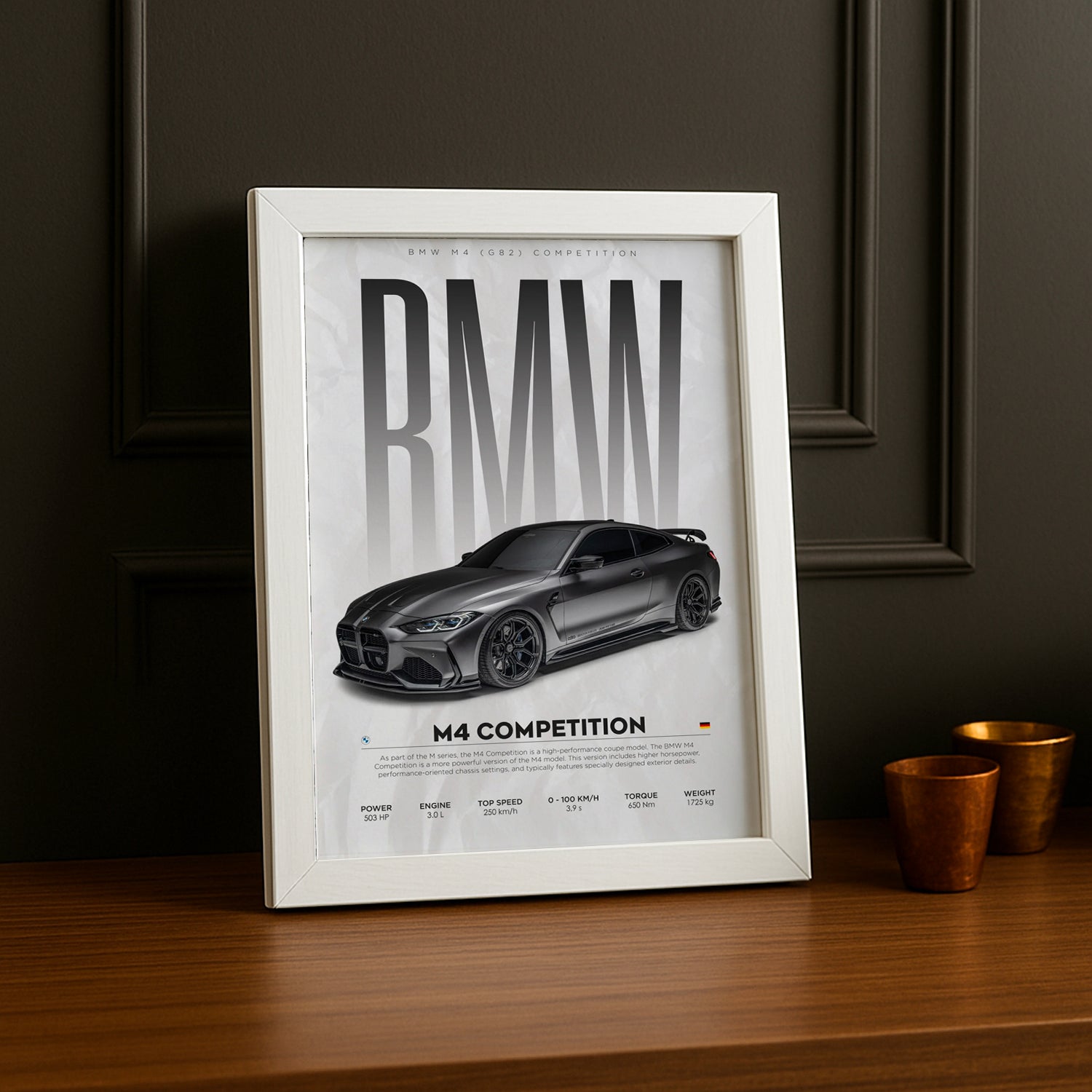 Un Chef-d'Œuvre Pour les Passionnés de Performance et de Luxe Affichez votre admiration pour la BMW M4 Competition avec ce cadre photo époustouflant ! Imprimé en haute définition, chaque détail met en valeur le design agressif, la performance impressionnante et l'élégance de cette voiture sportive de légende. Parfait pour ajouter une touche de vitesse et de sophistication à votre salon, bureau ou garage.