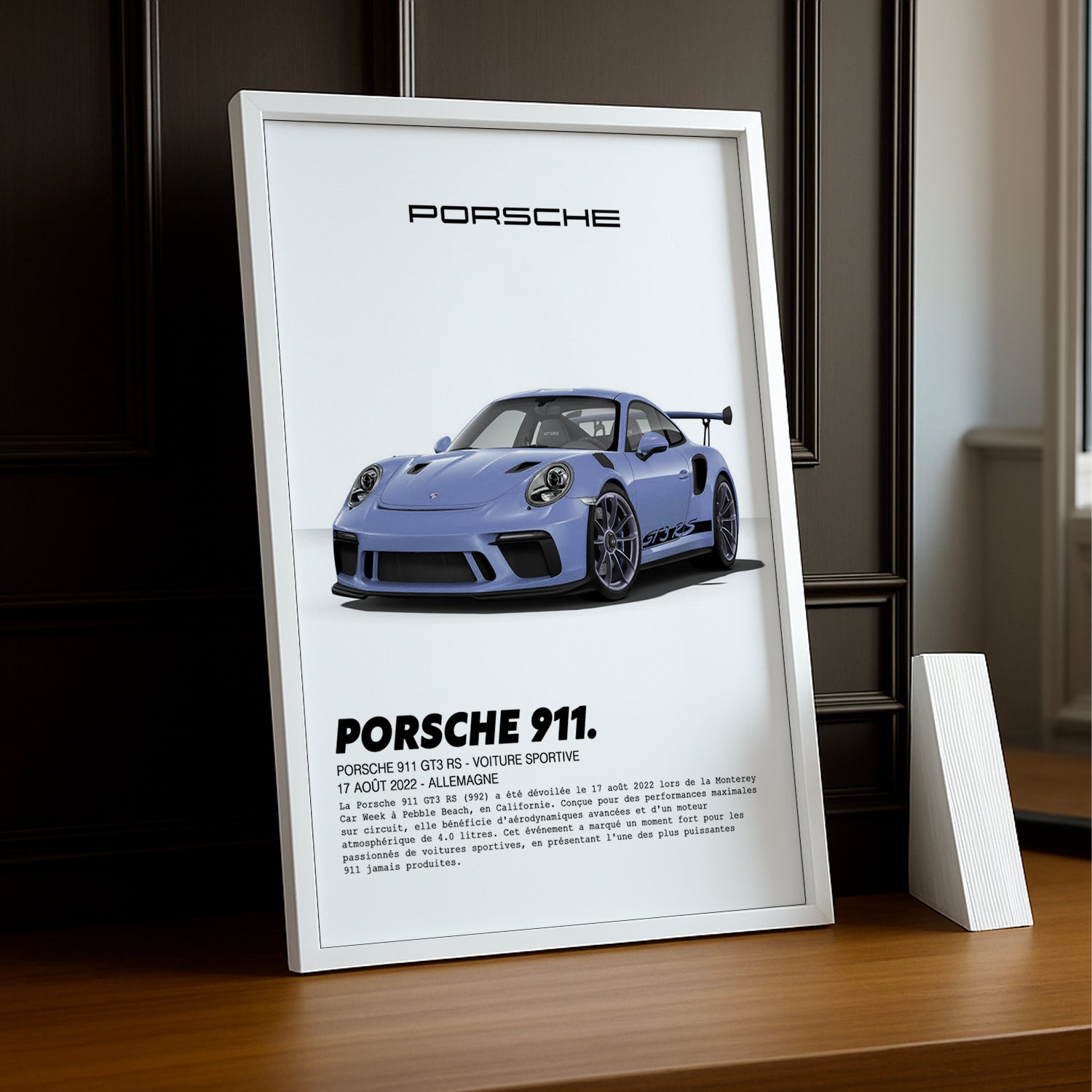 Sublimez votre intérieur avec ce cadre photo de la Porsche 911 GT3 RS dans une teinte lila rare et sophistiquée. Ce modèle exceptionnel allie une puissance impressionnante à une esthétique audacieuse, mettant en avant les lignes agressives et la silhouette aérodynamique qui font la renommée de la GT3 RS. La couleur lila ajoute une touche d'élégance inattendue à cette supercar de haute performance, faisant de ce cadre un choix parfait pour les amateurs de voitures au caractère unique.