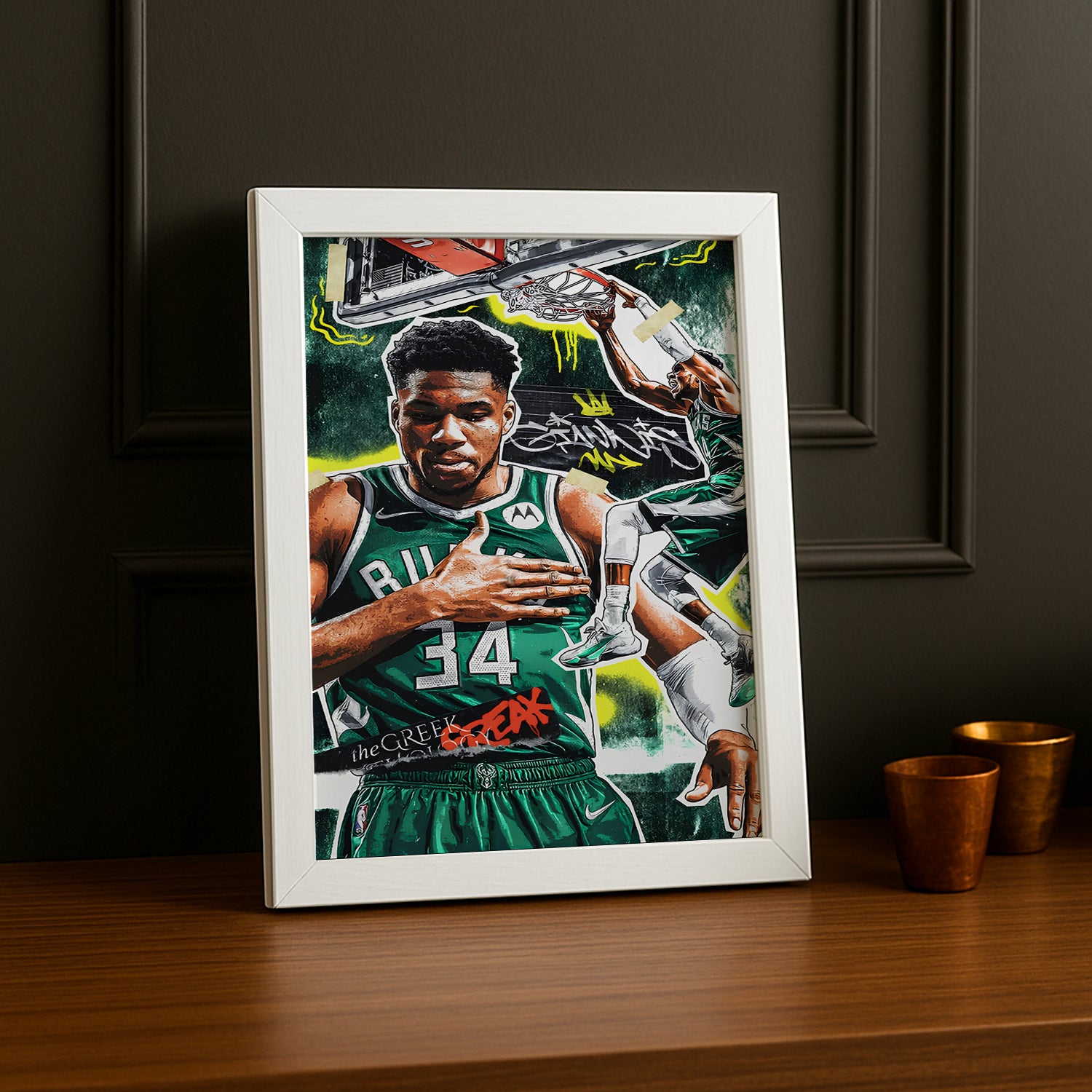 Apportez l’intensité du jeu dans votre intérieur avec ce cadre photo dédié à Giannis Antetokounmpo, l’"Greek Freak" et l'un des joueurs les plus dominants de la NBA. Ce cadre capture la force, la polyvalence et l'agilité de Giannis, connu pour ses dunks spectaculaires et sa détermination sans faille sur le terrain. Sa présence et son style unique inspirent par leur dynamisme et leur puissance, faisant de ce cadre un incontournable pour les fans de basketball.