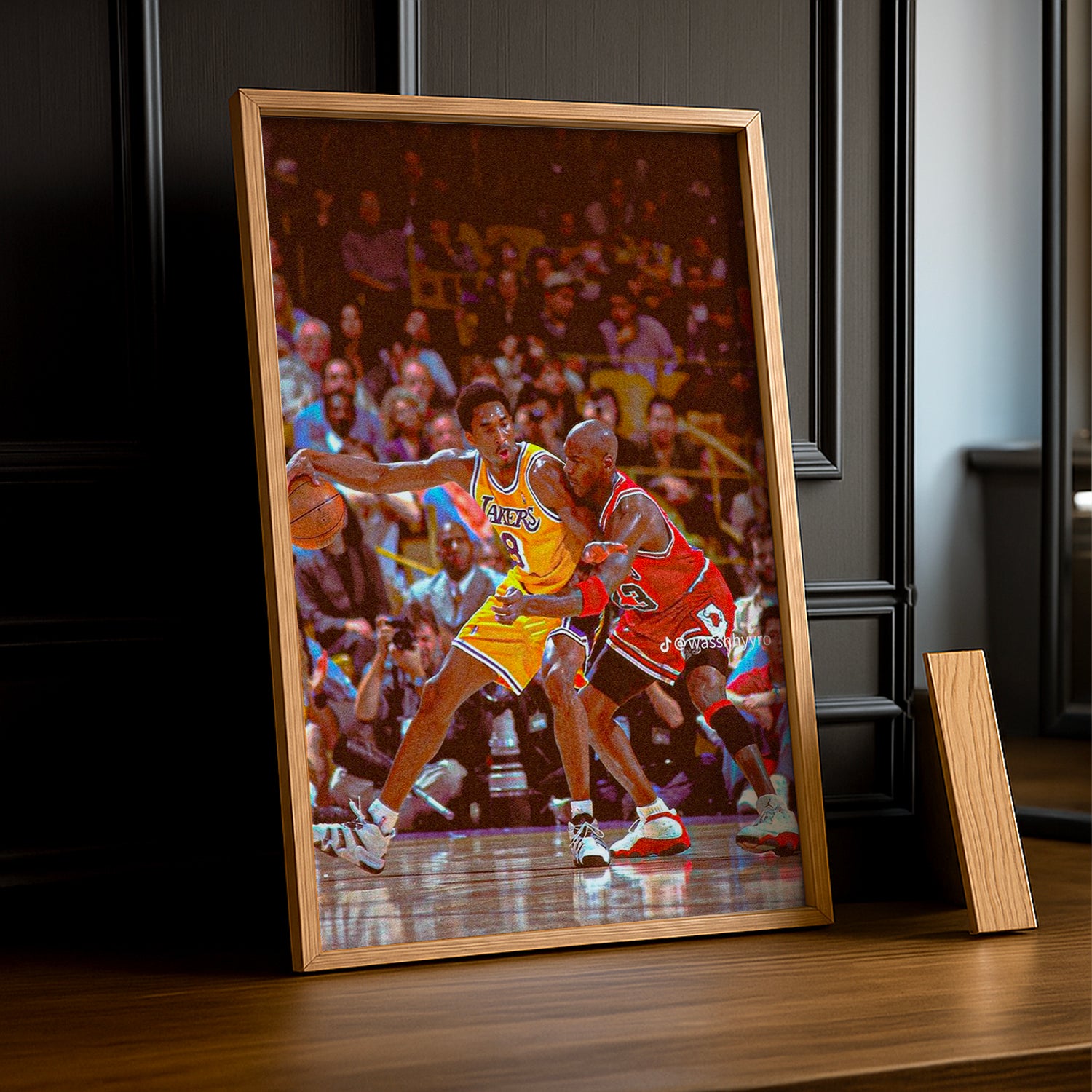 Ravivez le débat éternel avec ce cadre photo NBA mettant en scène le duel légendaire entre Kobe Bryant et Michael Jordan. Un design captivant qui célèbre deux générations de champions et leur quête commune de perfection. Parfait pour les fans qui adorent comparer les plus grandes légendes du basketball. Ce cadre incarne la rivalité amicale et le respect mutuel entre deux titans. À accrocher pour honorer le dialogue entre le GOAT et la Mamba, deux icônes qui ont marqué l'histoire du sport !