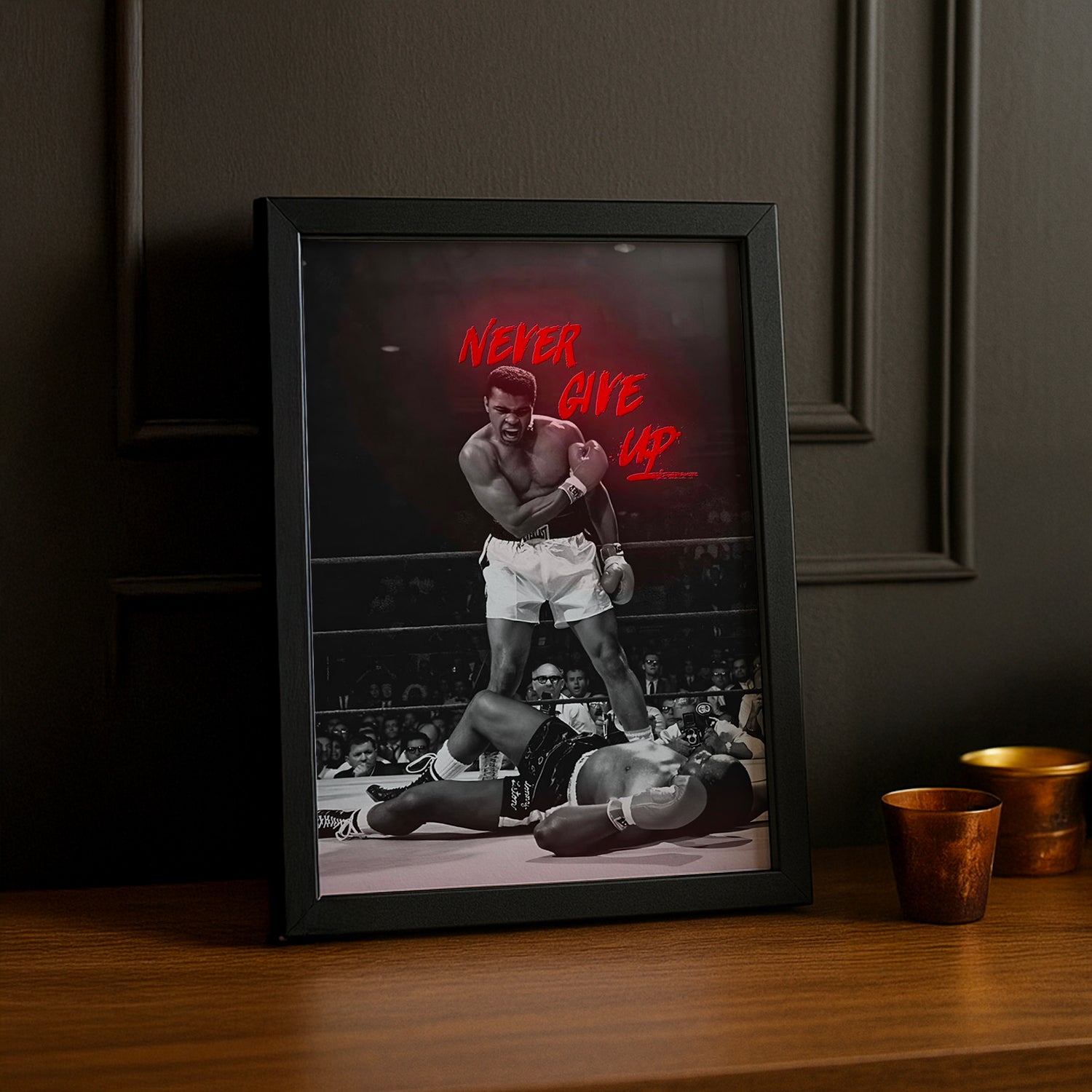 Gravez la détermination dans votre cœur avec ce cadre photo Boxe Muhammad Ali "Never Give Up" ! Un message motivant du plus grand champion de tous les temps qui inspire à repousser les limites. Ce cadre fusionne l'art et la philosophie de vie d'Ali, transformant votre mur en source quotidienne de courage et de résilience. Que vous le placiez dans votre chambre, votre bureau ou votre salle d'entraînement, ce cadre rappelle que l'abandon n'est jamais une option. Parfait pour les guerriers du quotidien qui puisent leur force dans l'héritage intemporel du légendaire Muhammad Ali !