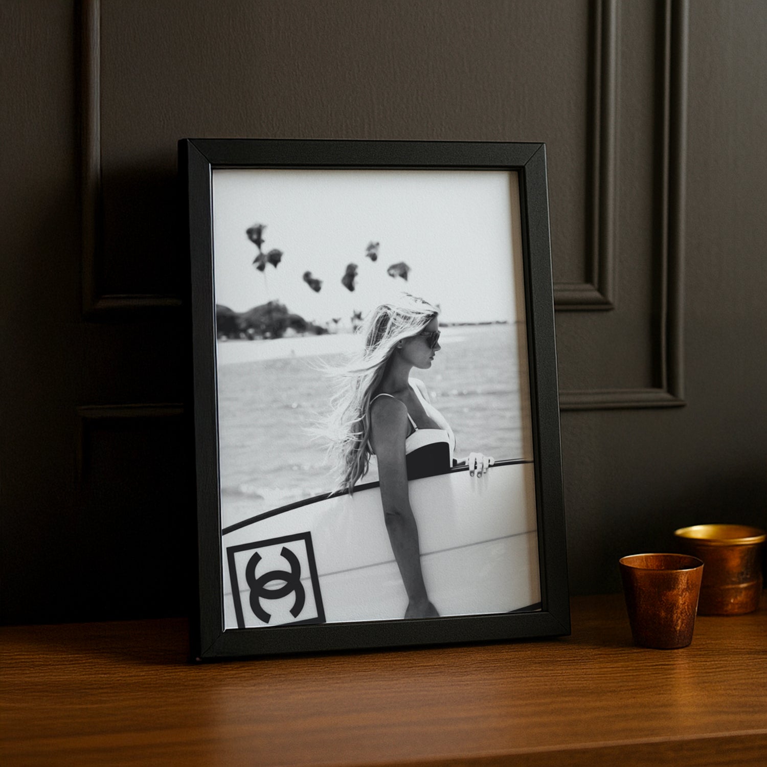 Mettez en valeur vos souvenirs de vacances avec ce cadre photo original de Chanel surf! Un clin d'œil amusant à la célèbre marque de mode, parfait pour votre décoration intérieure ou pour offrir en cadeau. Faites sensation avec ce cadre qui apportera une touche chic et décalée à votre intérieur.