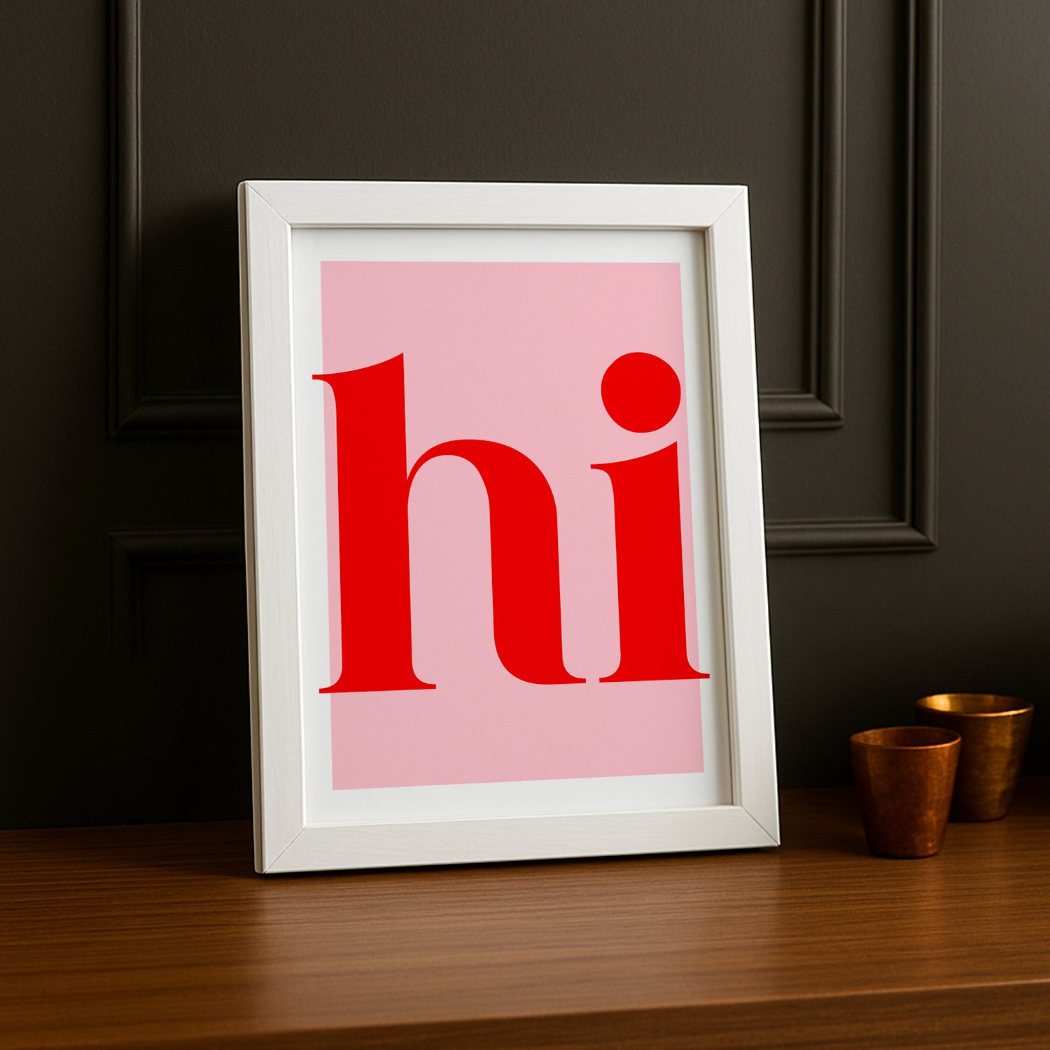 Cadre minimaliste et décontracté avec le simple message "Hi" - la salutation la plus cool pour accueillir vos visiteurs ! Ce cadre joue la carte de la simplicité avec style, parfait pour les amateurs d'humour discret et de design épuré. Accrochez-le à l'entrée pour un effet "bienvenue" amusant, ou dans une chambre pour une touche de légèreté. Petit mais puissant, ce cadre prouve qu'on n'a pas besoin de grands discours pour faire sourire !
