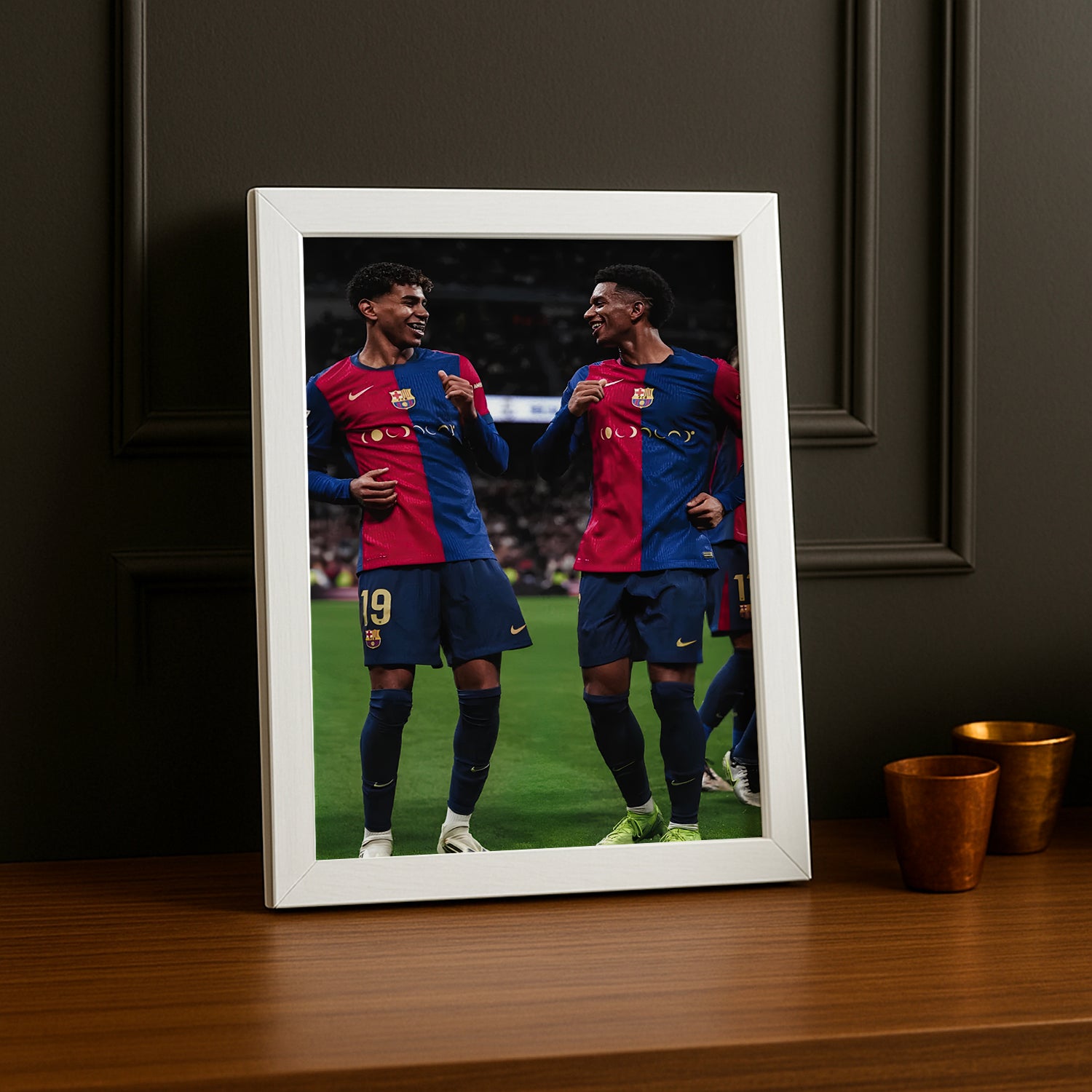 Un Chef-d'Œuvre Pour les Fans de Football et du FC Barcelone Affichez votre admiration pour Lamine Yamal et Alejandro Baldé, deux des jeunes talents les plus excitants du FC Barcelone, avec ce cadre photo exceptionnel ! Imprimé en haute définition, chaque détail capture la vitesse explosive de Baldé et la créativité fulgurante de Yamal, incarnant l’avenir radieux du Barça et l'excellence de sa célèbre Masia.