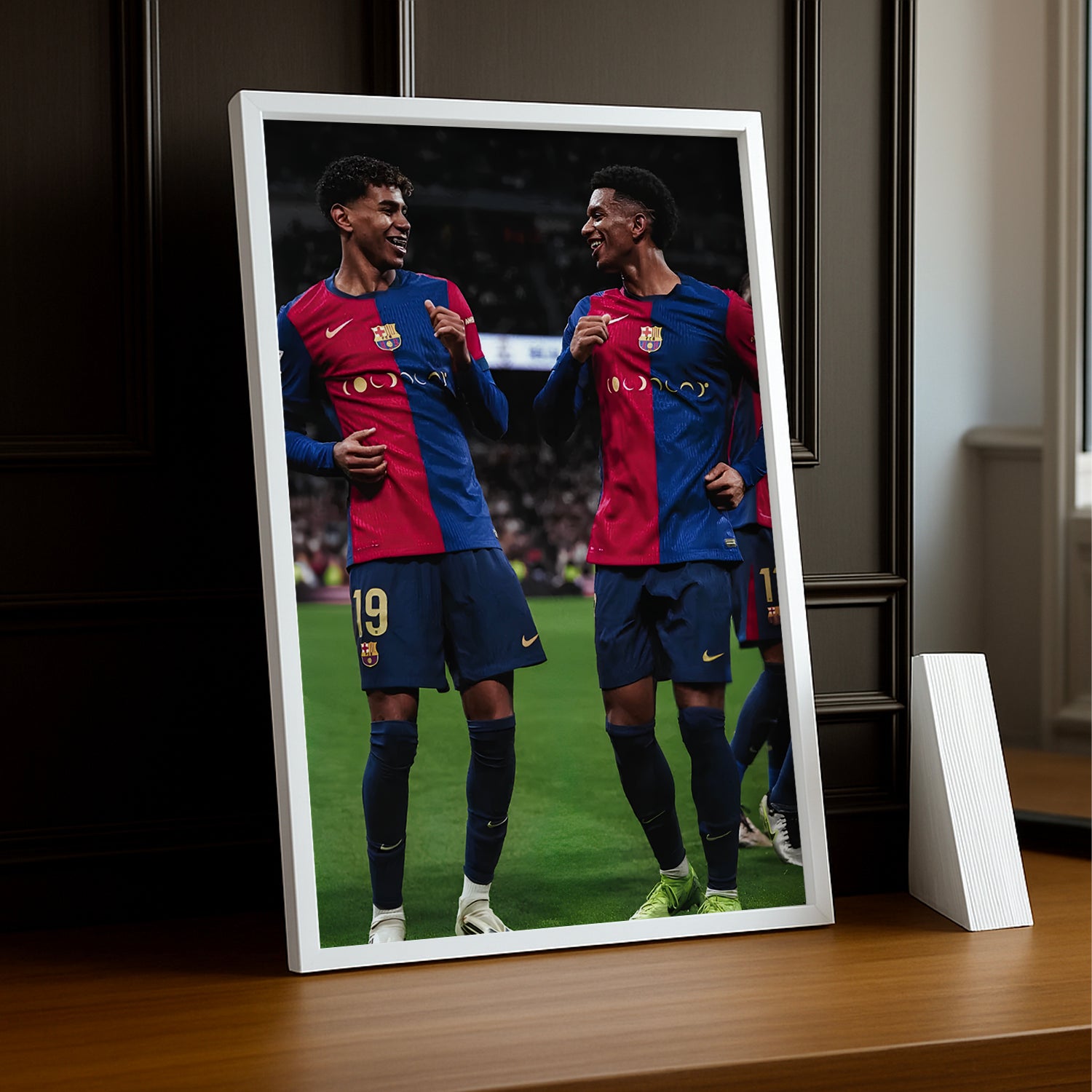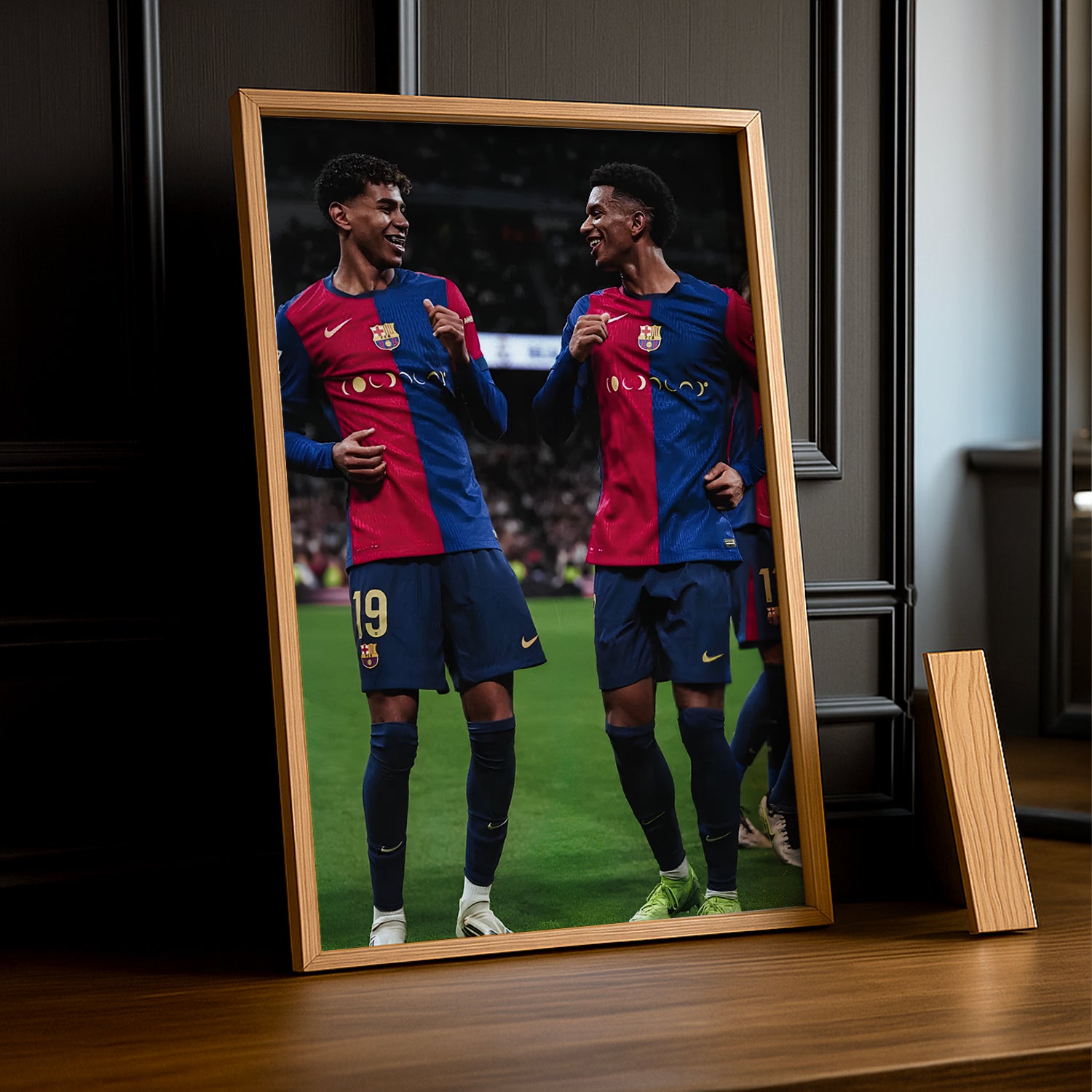 Ajoutez une Touche de Jeunesse et de Dynamisme à Votre Décor Parfait pour tout fan du FC Barcelone, ce cadre est un hommage au futur du football et un cadeau idéal pour célébrer ces deux prodiges.