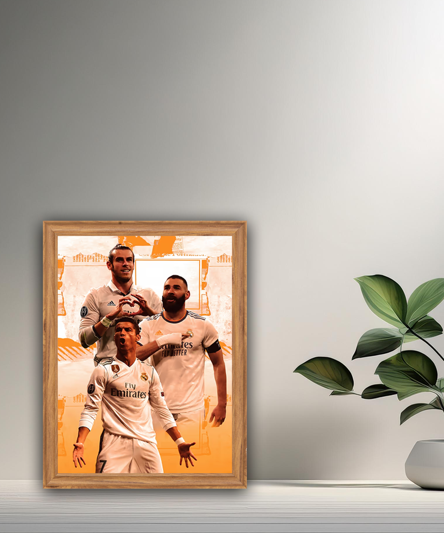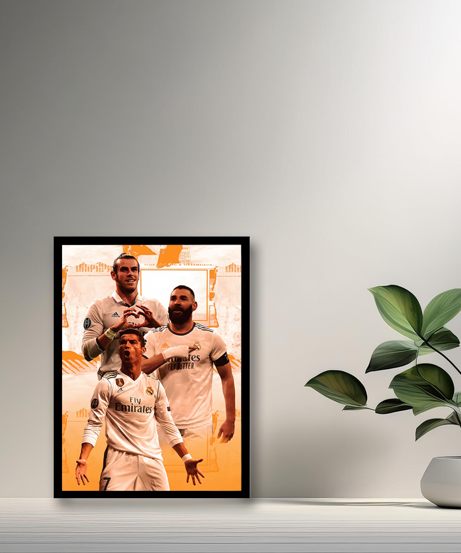 Un Chef-d'Œuvre Pour les Fans de Football et du Real Madrid Affichez votre admiration pour le trio d'attaque mythique du Real Madrid : Karim Benzema, Gareth Bale et Cristiano Ronaldo. Ce cadre photo exceptionnel capture l’essence de ce trio légendaire qui a dominé le football mondial, marqué l'histoire du Real Madrid et remporté de nombreuses Ligas et Ligue des Champions. Imprimé en haute définition, chaque détail met en valeur leur puissance, leur alchimie et leurs exploits inoubliables.