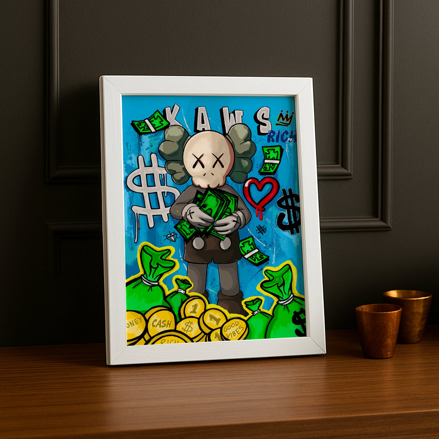 Affiche Kaws money pour apporter une touche d'originalité à votre décoration. Laissez-vous séduire par ces billets stylisés créés par l'artiste Kaws. Idéal pour les amateurs d'art et de streetwear. À accrocher sur le mur (pas dans votre portefeuille).