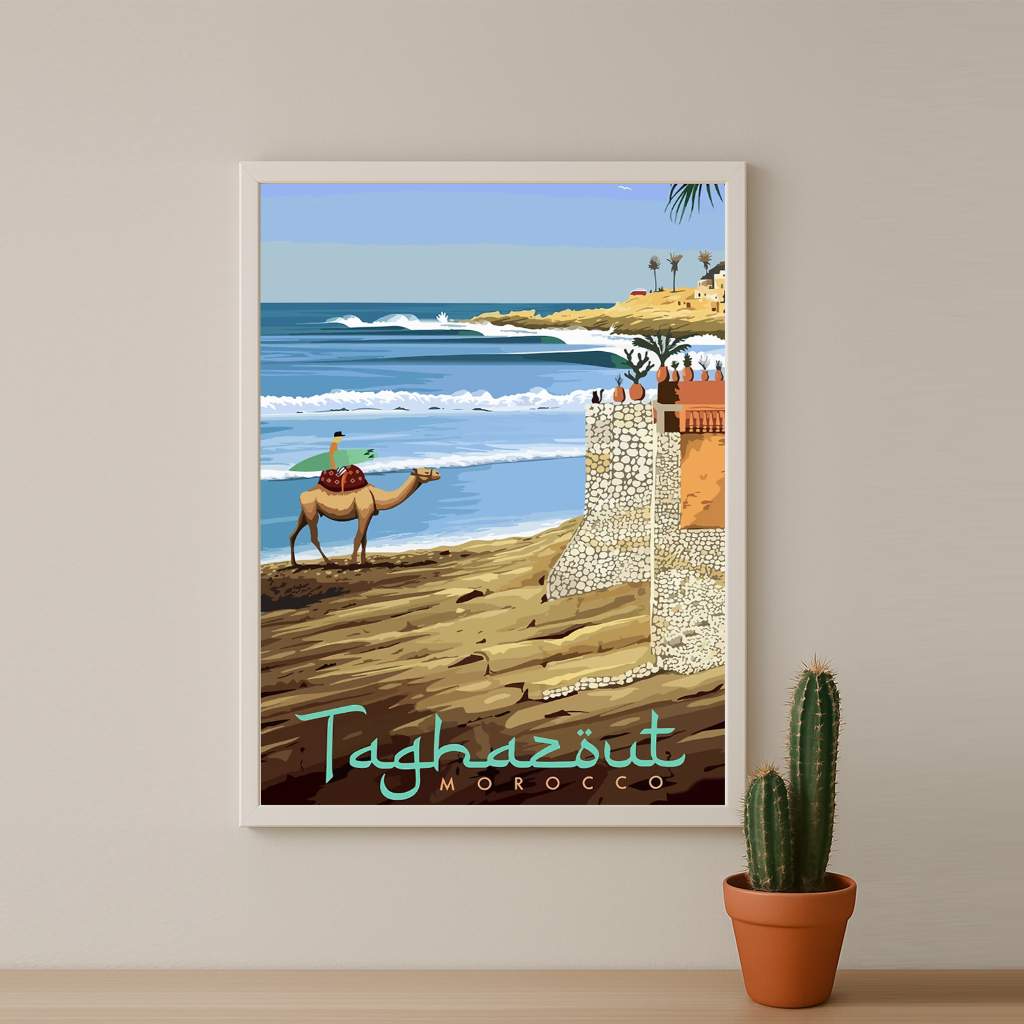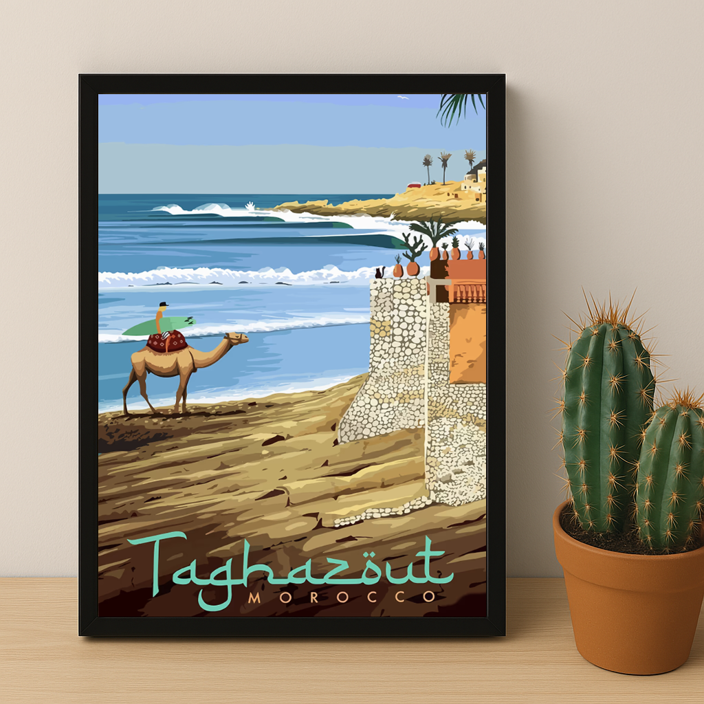 Apportez une vague de bonne humeur à votre déco avec ce cadre photo Taghazout Maroc ! Parfait pour les amoureux de surf et de soleil, il capture l’ambiance décontractée et colorée de ce village côtier. Facile à accrocher, il transforme vos souvenirs en une invitation au voyage et à la détente. Un petit clin d’œil joyeux qui fera surfer la joie sur vos murs !