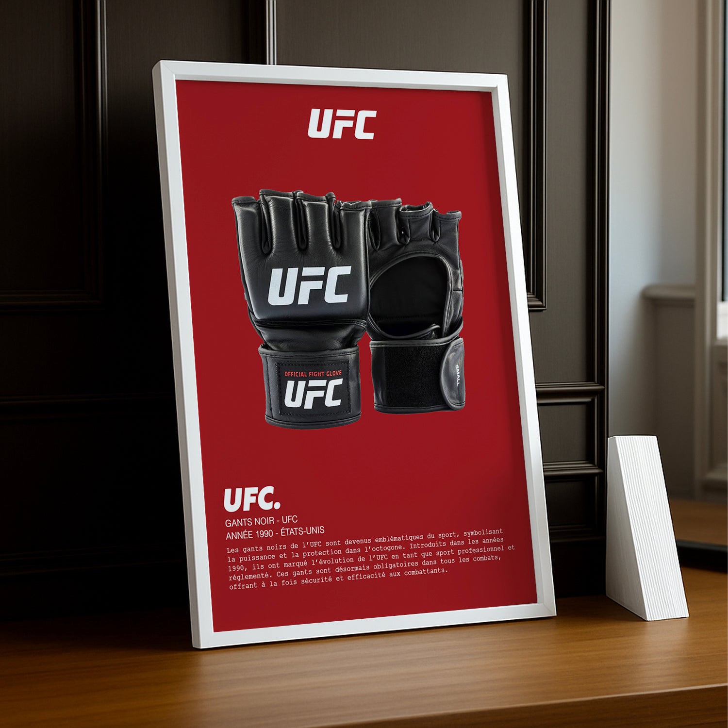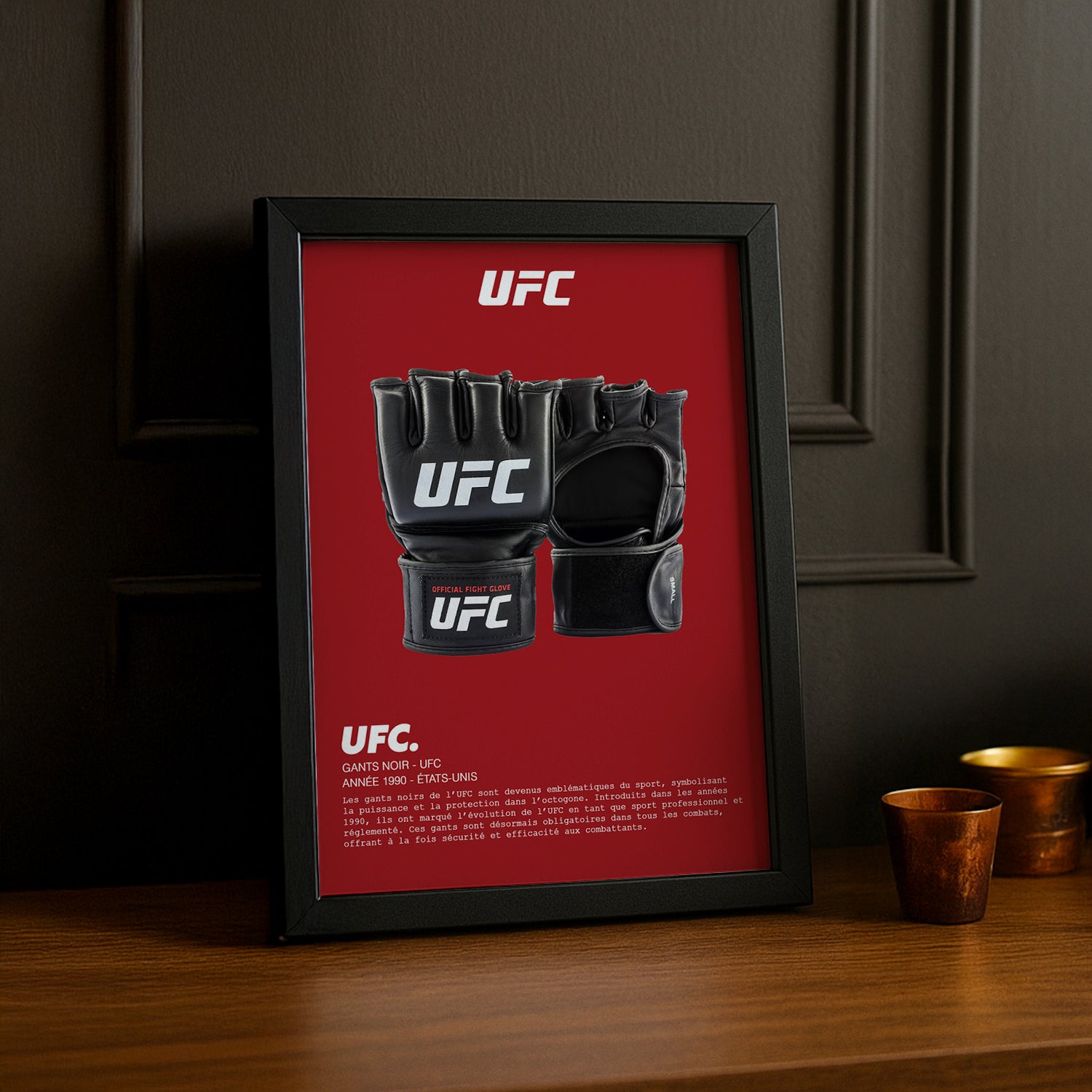 Ce cadre photo célèbre non seulement l'équipement essentiel des athlètes, mais aussi la passion et la bravoure qu'ils démontrent dans l’octogone. Que vous soyez un fan inconditionnel de l'UFC, un passionné d'arts martiaux ou simplement à la recherche d'une pièce décorative inspirante, ce cadre devient un point focal captivant dans n’importe quelle pièce.