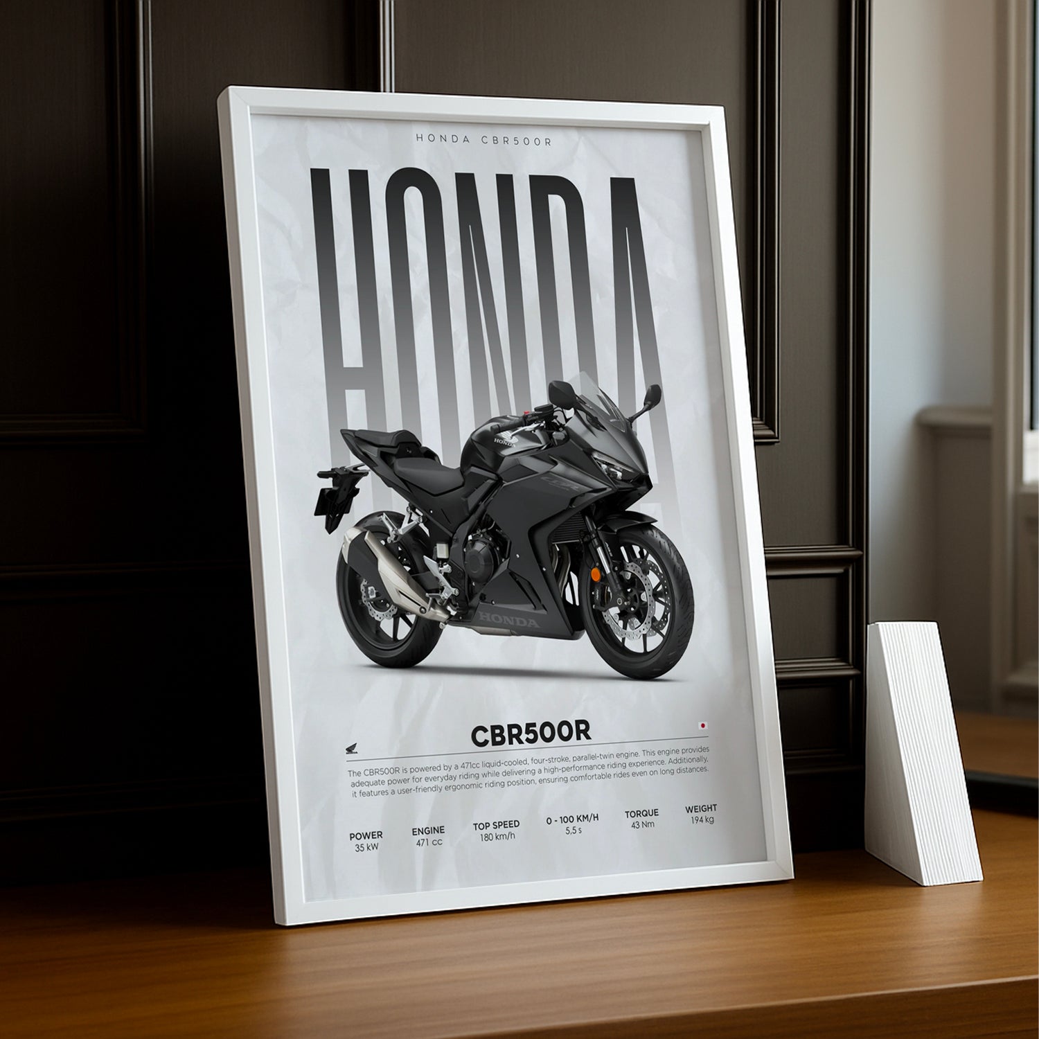 Un Chef-d'Œuvre Pour les Fans de Moto Affichez votre passion pour la Honda CBR500R, une moto sport compacte alliant performance et design dynamique, avec ce cadre photo captivant ! Imprimé en haute définition, ce cadre capture l'agilité, la puissance et l'adrénaline qui définissent la CBR500R. Avec son style agressif, ses lignes aérodynamiques et sa maniabilité exceptionnelle, cette moto incarne la liberté de rouler à toute vitesse sur la route.