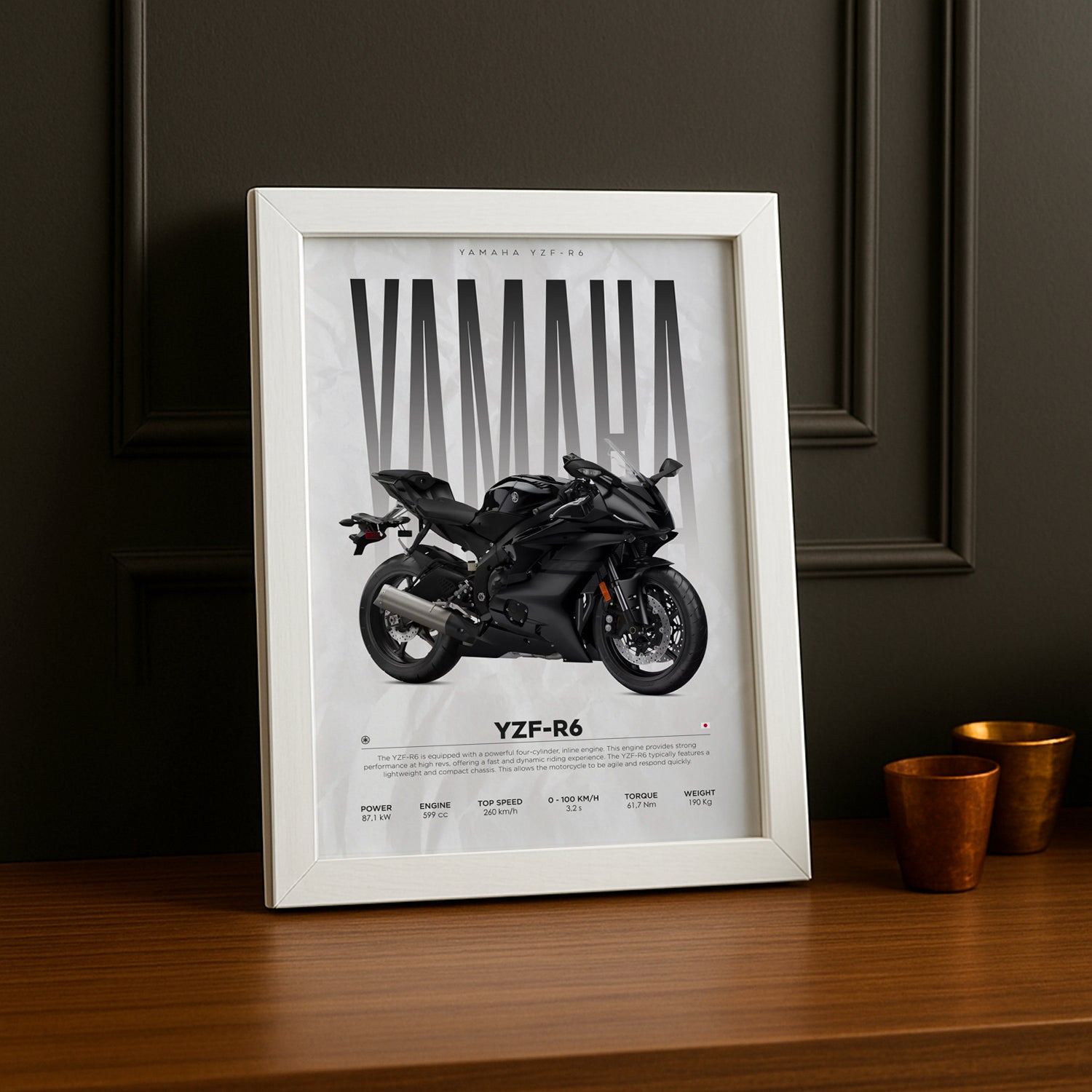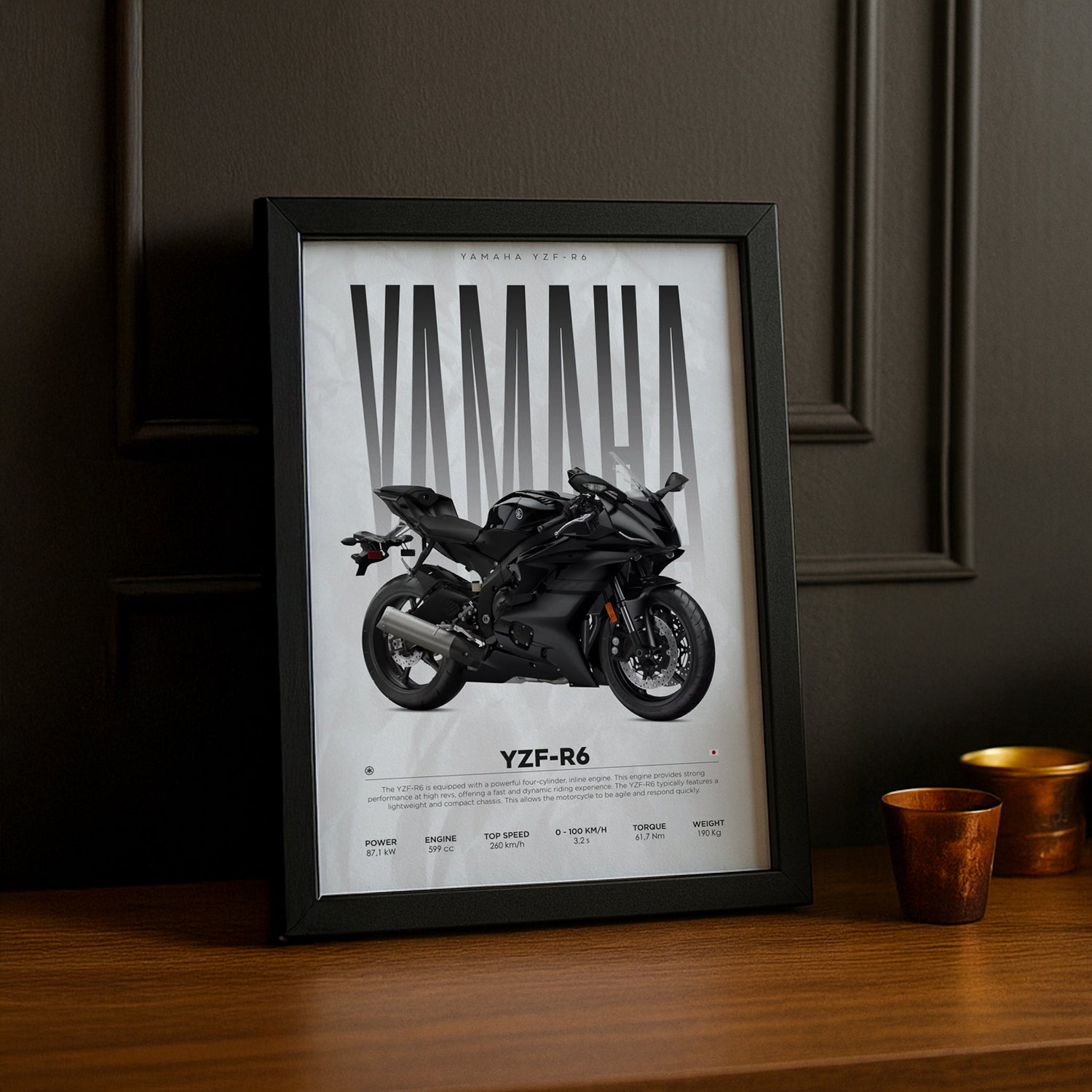 Un Chef-d'Œuvre Pour les Fans de Moto Affichez votre passion pour la Yamaha YZF-R6, l'une des motos sportives les plus emblématiques de la marque, avec ce cadre photo impressionnant ! Imprimé en haute définition, ce cadre capture l'esprit de la YZF-R6, célèbre pour sa performance exceptionnelle, sa maniabilité précise et son design raffiné. Conçue pour les passionnés de vitesse et de sensations fortes, la R6 est un modèle parfait pour ceux qui recherchent à la fois puissance et agilité sur deux roues.