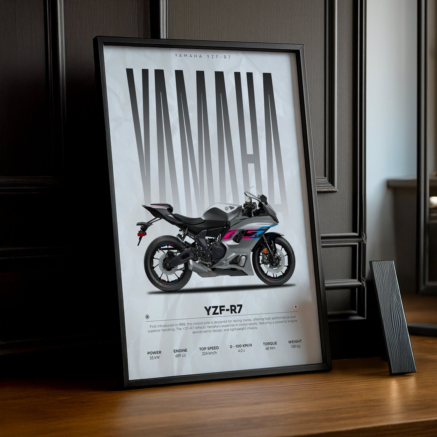 Un Chef-d'Œuvre Pour les Fans de Moto Affichez votre passion pour la Yamaha YZF-R7, une moto sport de précision alliant puissance et style, avec ce cadre photo dynamique ! Imprimé en haute définition, ce cadre capture l'élégance et la performance de la YZF-R7, la moto qui combine parfaitement maniabilité agile et caractéristiques techniques de pointe. Avec son design aérodynamique et sa silhouette sportive, cette moto est un modèle incontournable pour les passionnés de conduite sur route et circuit.