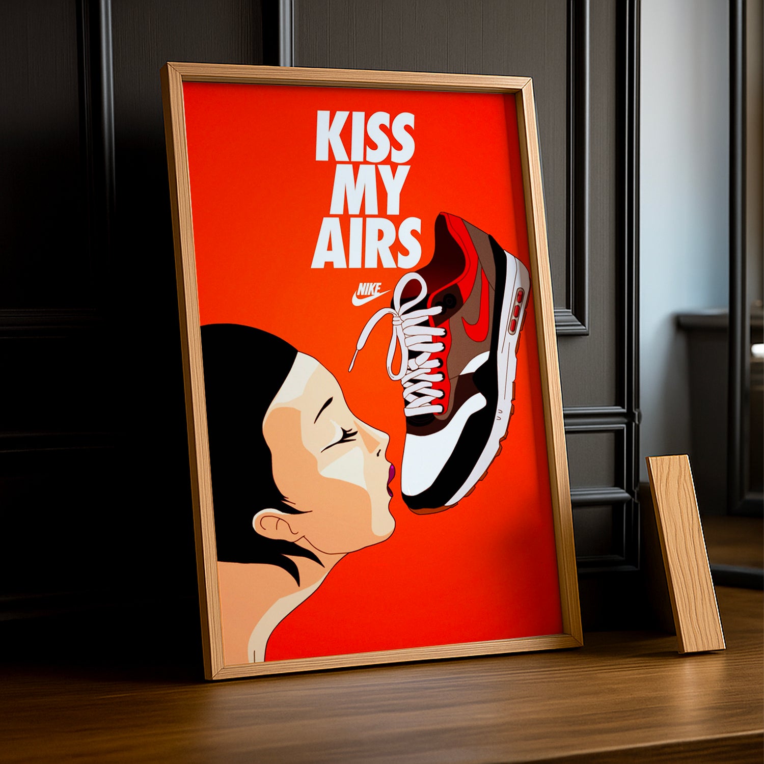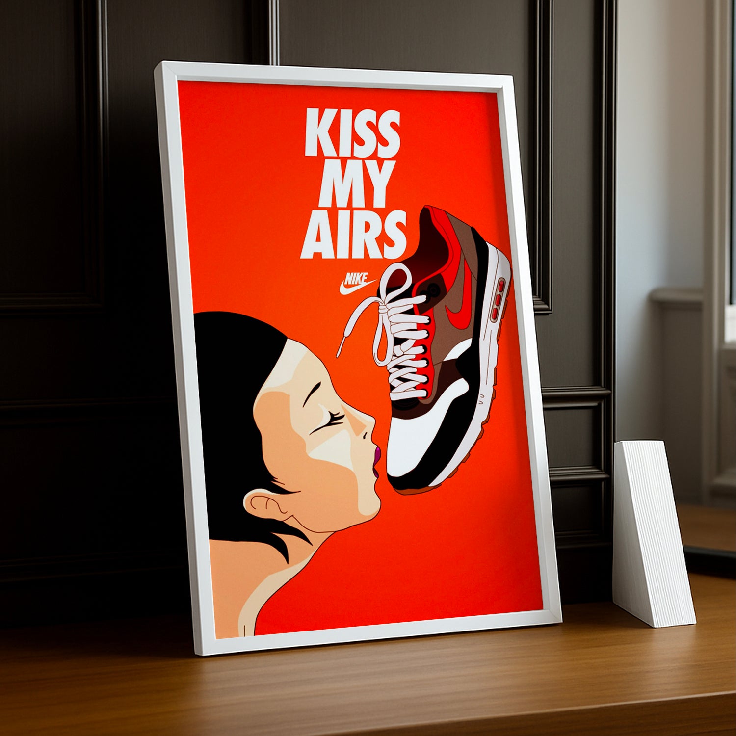 Affichez vos souvenirs avec style grâce à ce cadre photo "Kiss My Airs" de Nike. Mettez en valeur vos clichés préférés avec cet accessoire à l'esprit sportif qui ajoutera une touche amusante et décalée à votre décoration intérieure. Idéal pour les amateurs de sneakers et de mode streetwear. (N'appuyez pas trop fort sur le bouton "kiss" !)