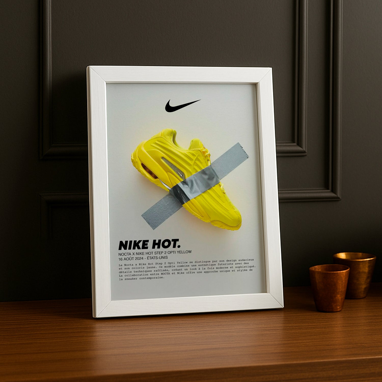 Sublimez votre intérieur avec ce cadre photo exclusif dédié à la collaboration entre Nike et NOCTA. Le modèle Hot Step 2 Opti Yellow, avec son design audacieux et ses lignes épurées, est magnifiquement mis en valeur dans ce cadre qui capture l'esprit avant-gardiste de la sneaker.