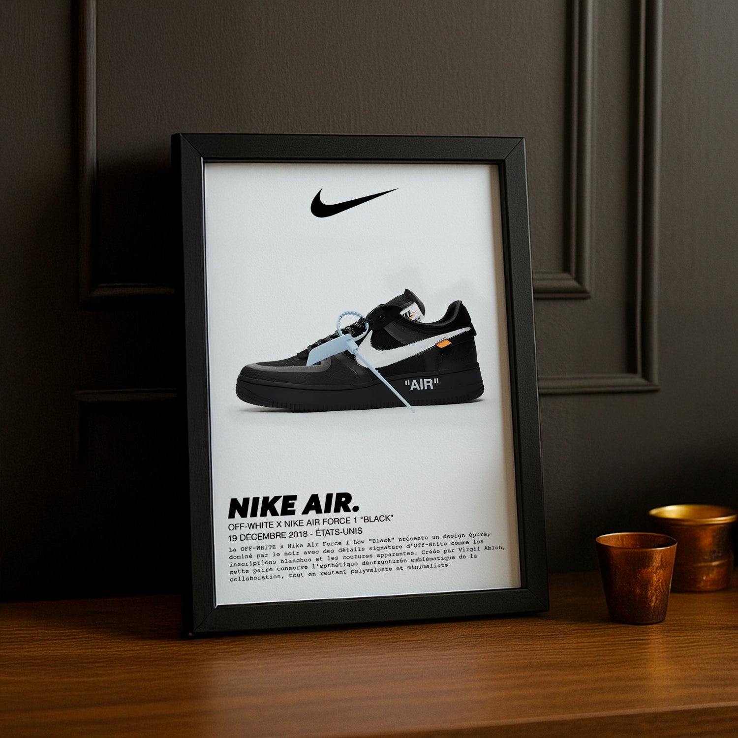 Disponible en plusieurs formats, ce cadre photo est parfait pour habiller un salon, un bureau ou un espace créatif. Exposez la Off-White x Nike Air Force 1 "Black" sur vos murs et laissez cette œuvre de design et de culture sneaker apporter une touche de style urbain sophistiqué à votre intérieur.
