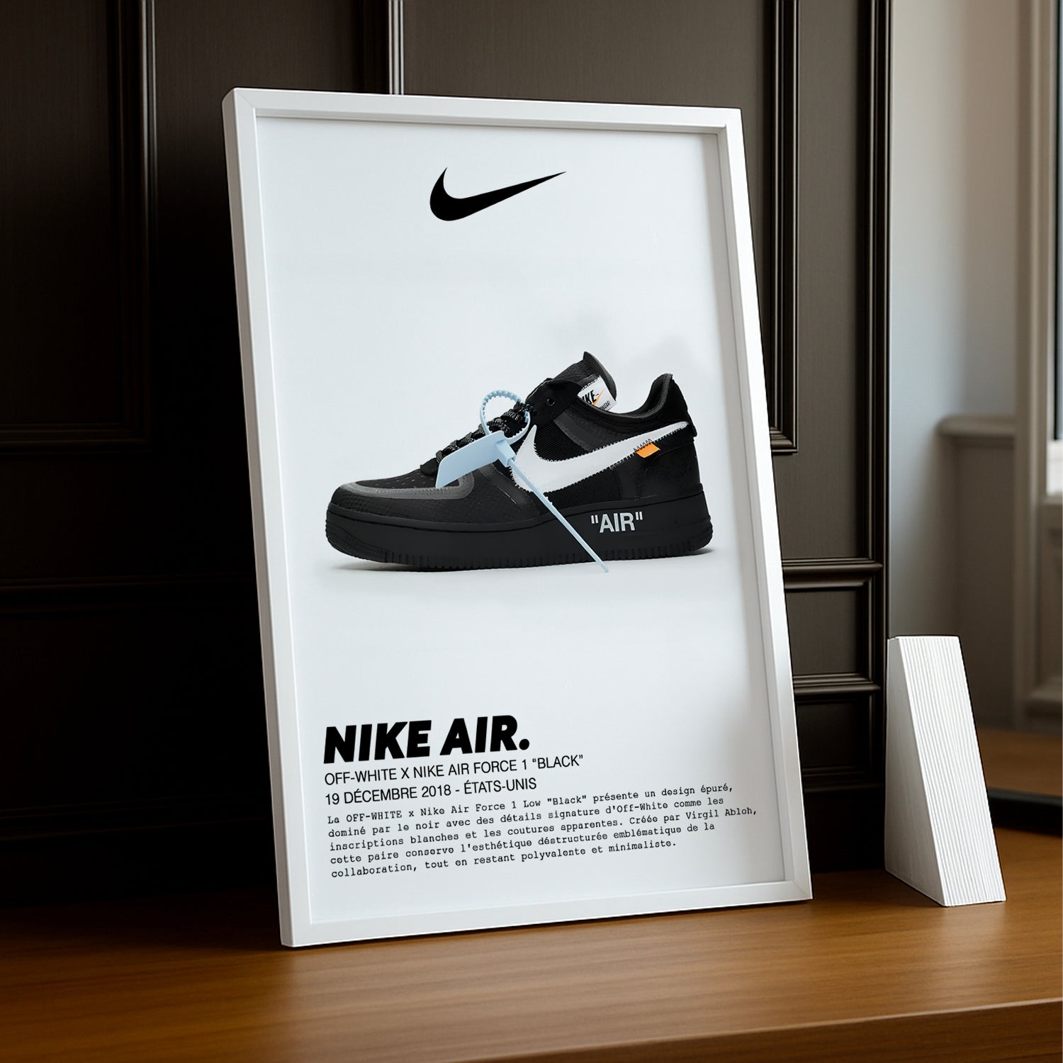 Apportez une touche d'élégance et de modernité à votre décoration avec ce cadre photo dédié à la Off-White x Nike Air Force 1 "Black". Issue de la collaboration emblématique entre Virgil Abloh et Nike, cette sneaker est un parfait mélange de minimalisme et de luxe urbain. Avec sa teinte noire élégante, ses matériaux premium et ses détails iconiques comme le Swoosh argenté et les marquages industriels d'Off-White, cette paire incarne l’innovation et la créativité à l'état pur.