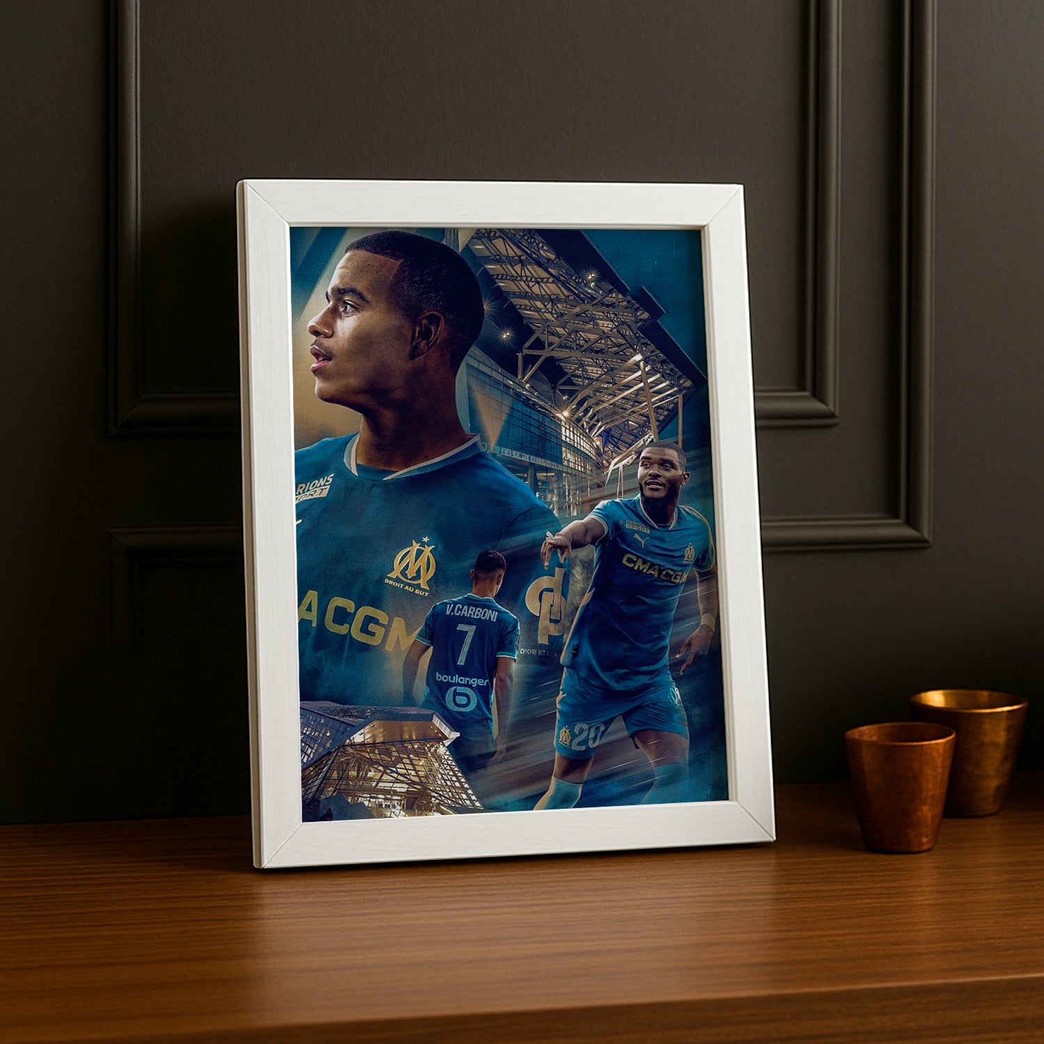 Cadre photo illustrant l'Olympique de Marseille. Une touche artistique pour célébrer l'esprit et l'histoire de ce grand club de football.
