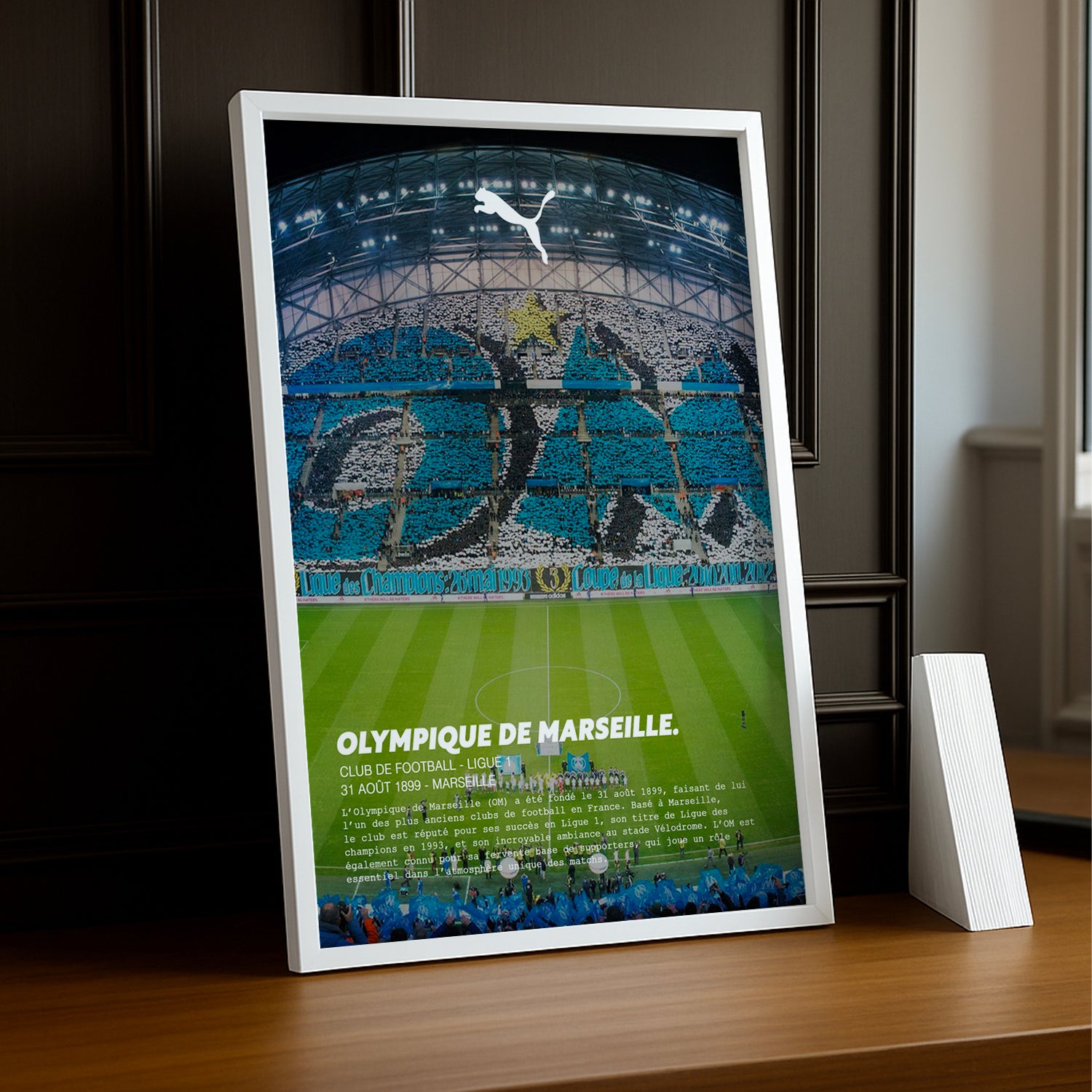 Cadre photo représentant le stade mythique de l'Olympique de Marseille. Idéal pour les supporters souhaitant immortaliser l'âme du Vélodrome chez eux !