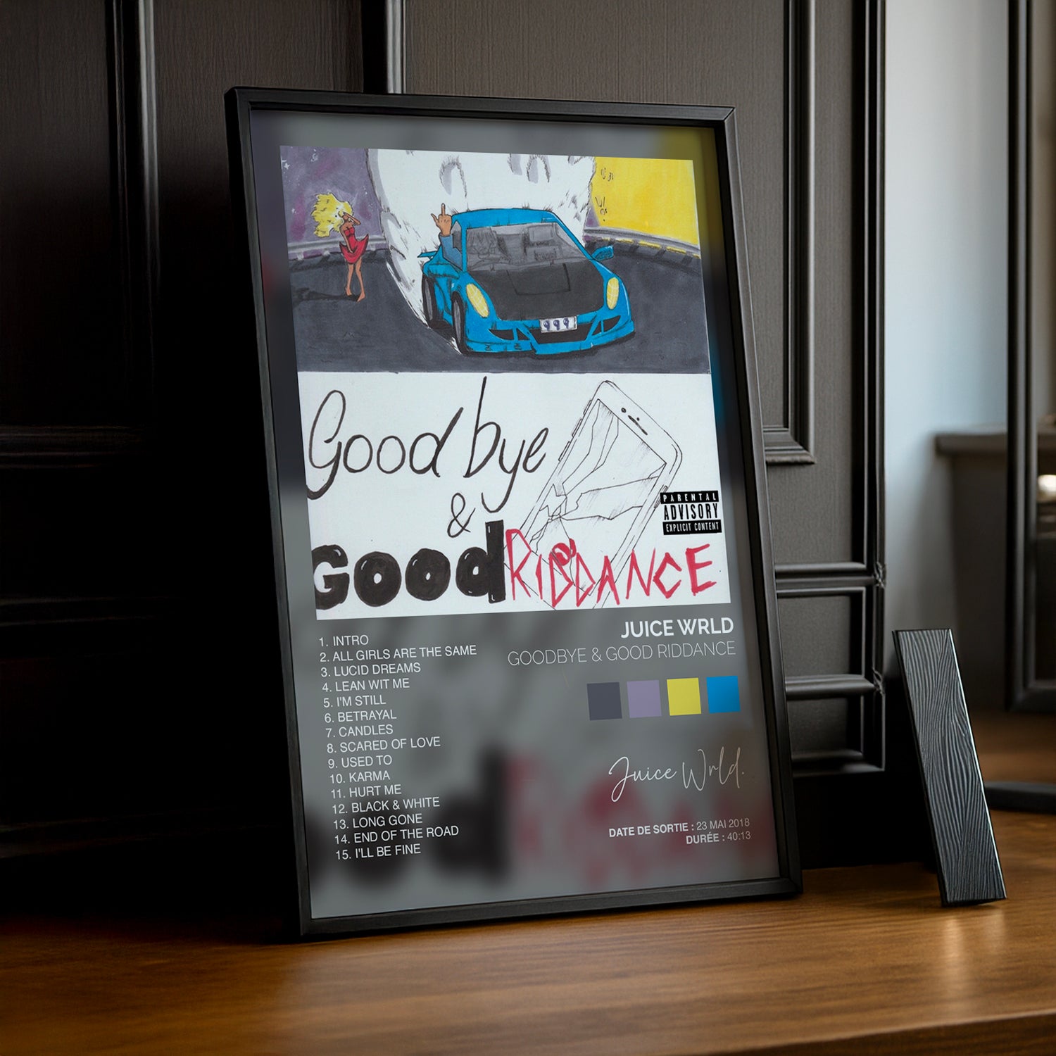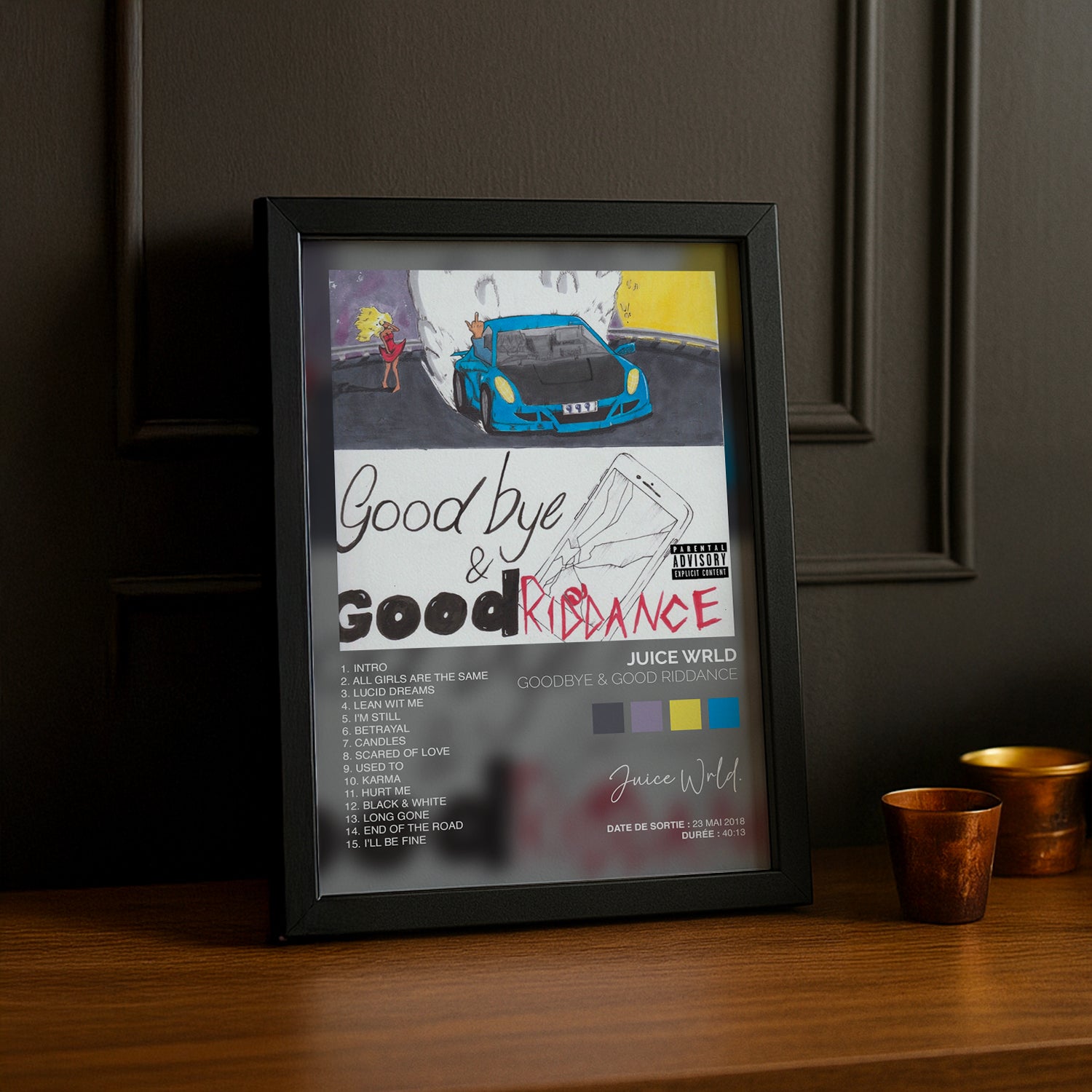 Immortalise l’émotion et le style unique de Juice WRLD avec ce poster exclusif de l’album "Goodbye & Good Riddance". Parfait pour tous les fans de rap emo et hip-hop mélodique, ce visuel puissant apportera une ambiance authentique à ta déco.