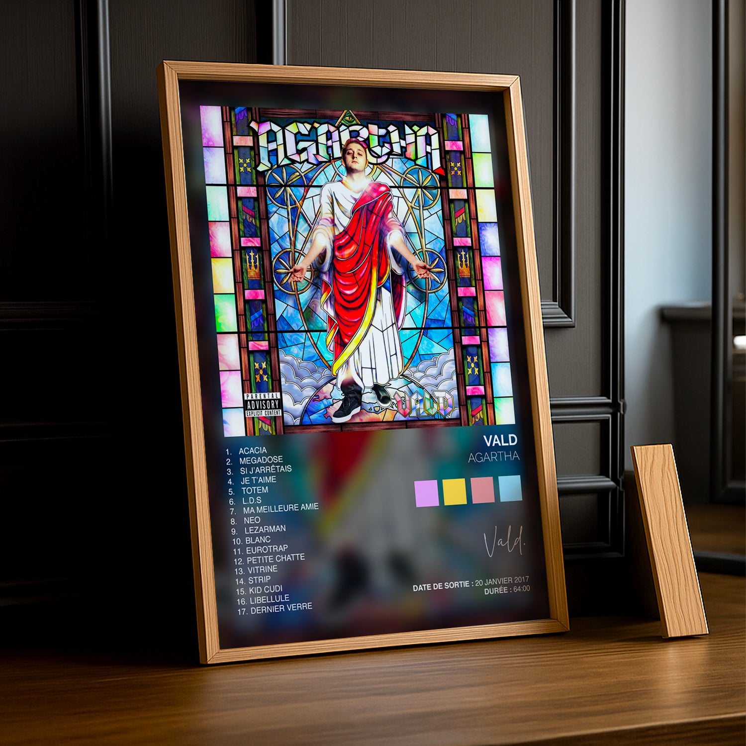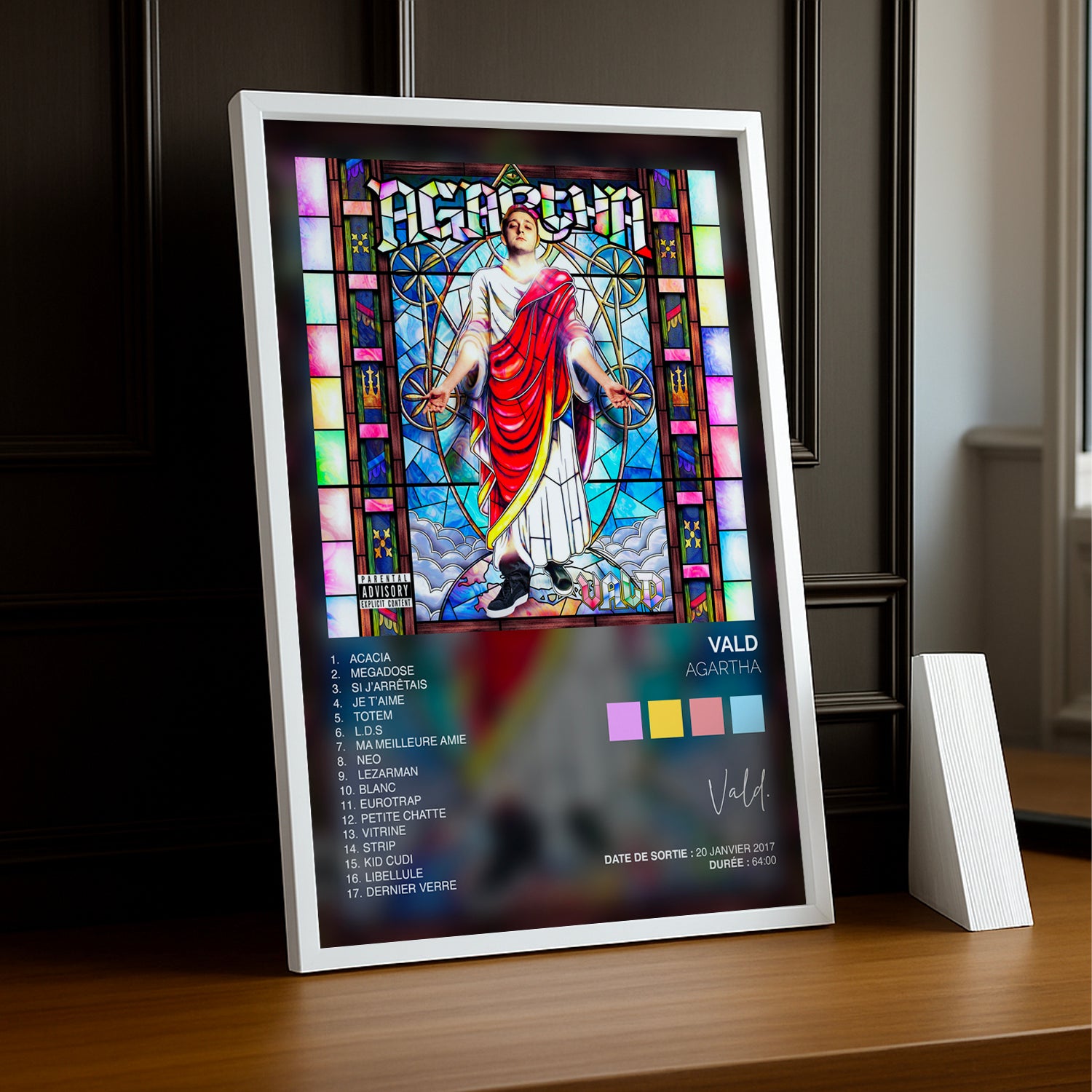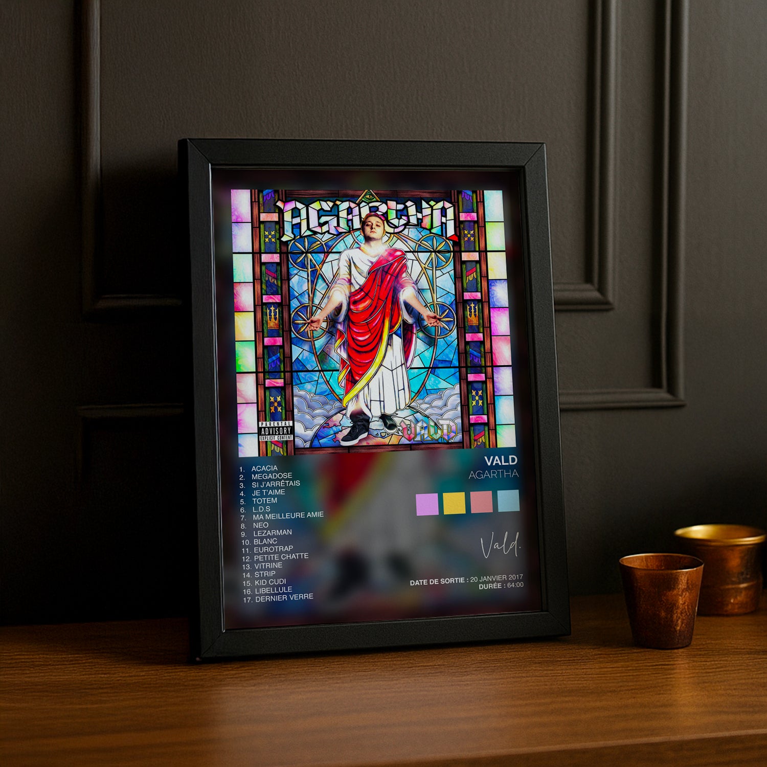 Plongez dans l'univers sombre et captivant d'Agartha avec ce cadre photo dédié à Vald. Parfait pour les fans du rappeur français, ce cadre met en avant l'esthétique brute et mystérieuse de l'album culte. Que vous soyez collectionneur de souvenirs musicaux ou admirateur du style unique de Vald, ce cadre transforme votre espace en galerie personnelle. À accrocher fièrement sur vos murs pour célébrer votre passion pour la musique urbaine française.