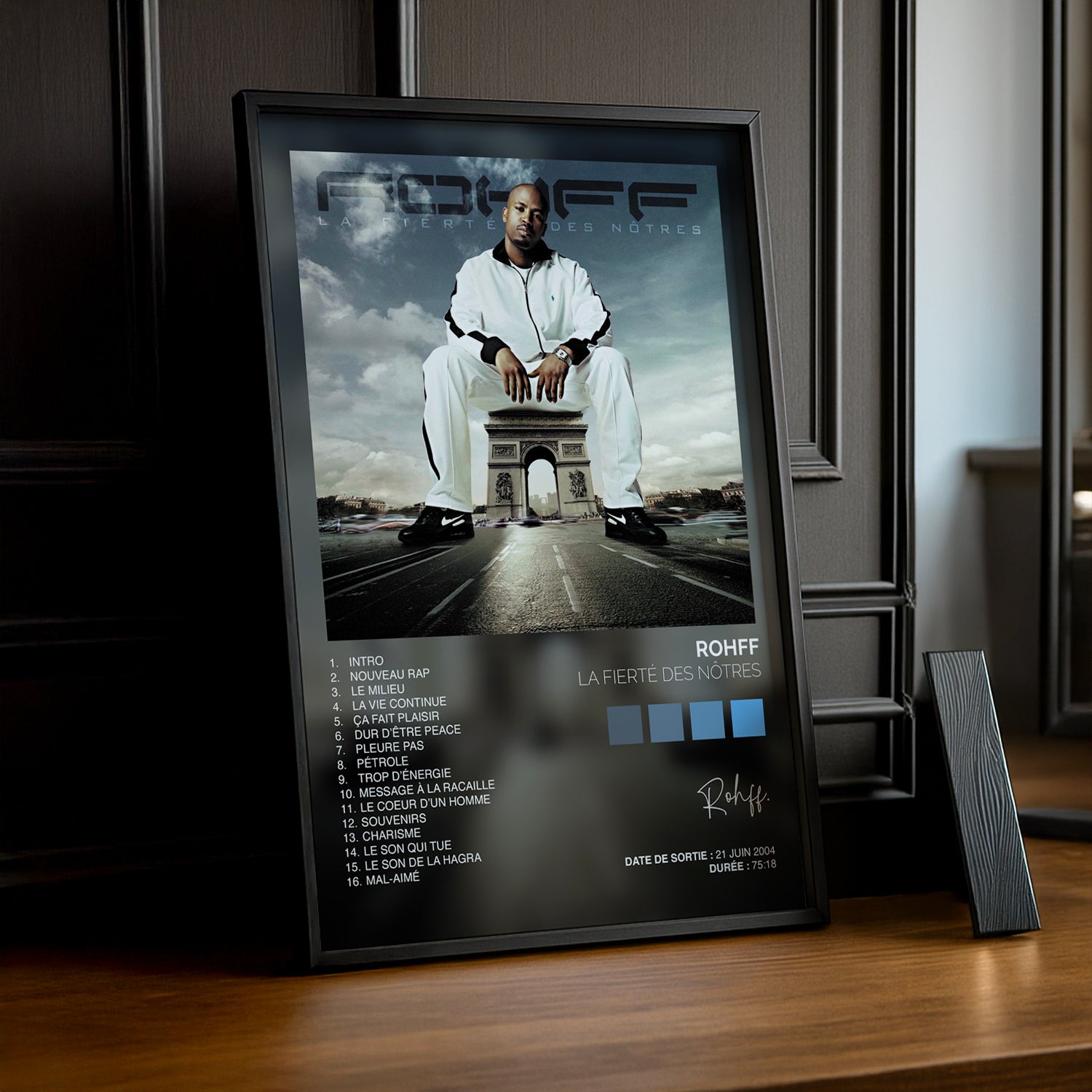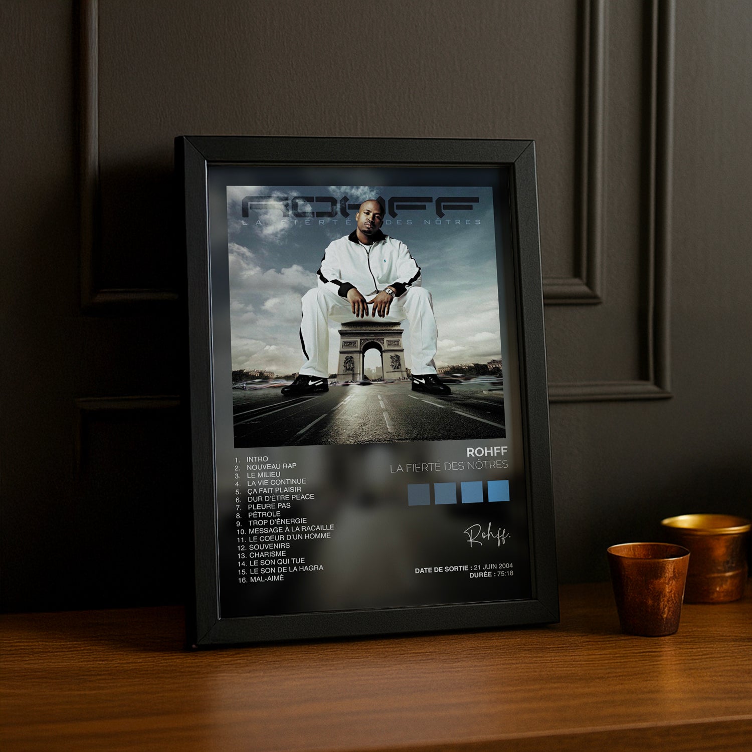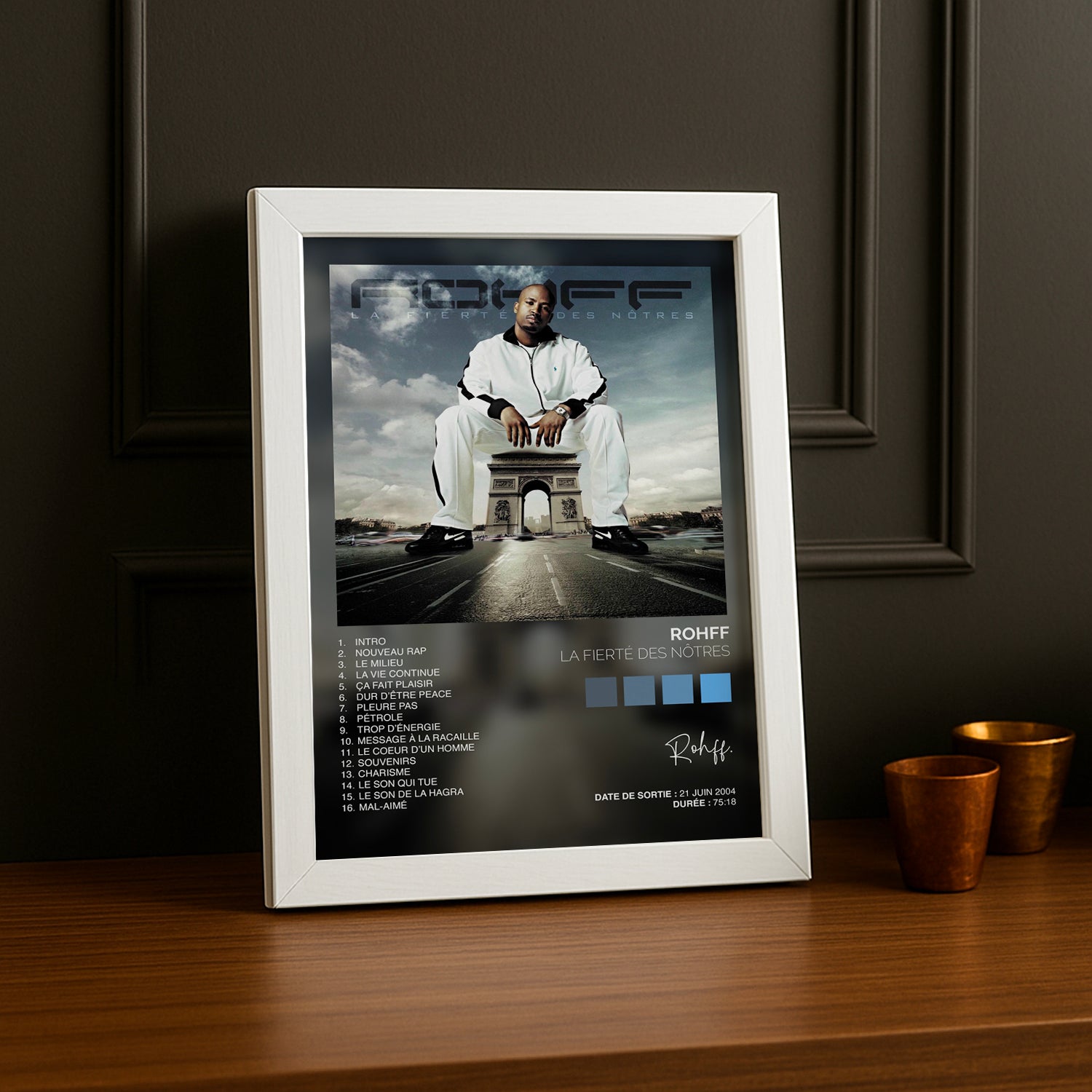 Célébrez l'icône du rap français avec ce cadre photo dédié à Rohff et son album culte "La fierté des nôtres". Un hommage vibrant à l'artiste qui a marqué les générations, parfait pour les fans inconditionnels. Affichage élégant et moderne qui transforme votre espace en galerie personnelle. À accrocher fièrement sur vos murs pour rappeler que la vraie fierté, c'est de rester fidèle à ses racines et à ses passions musicales.