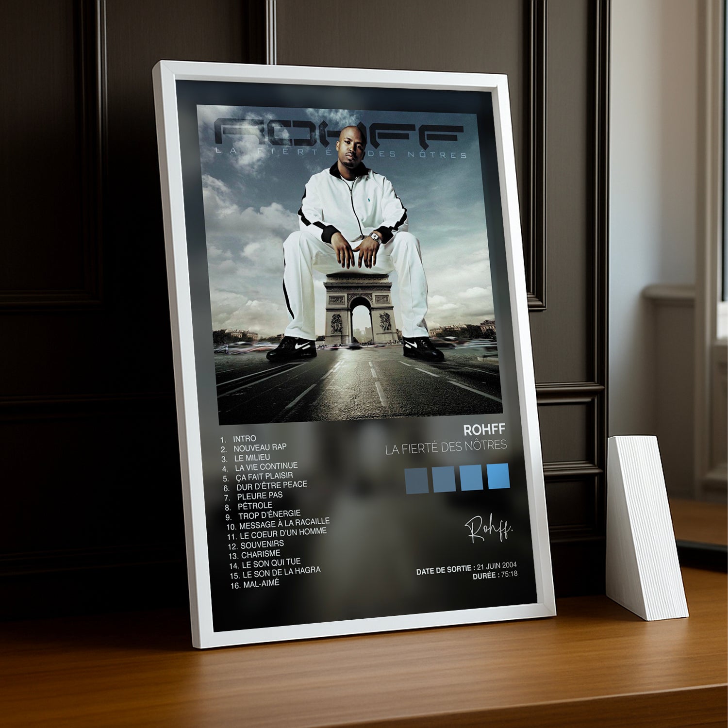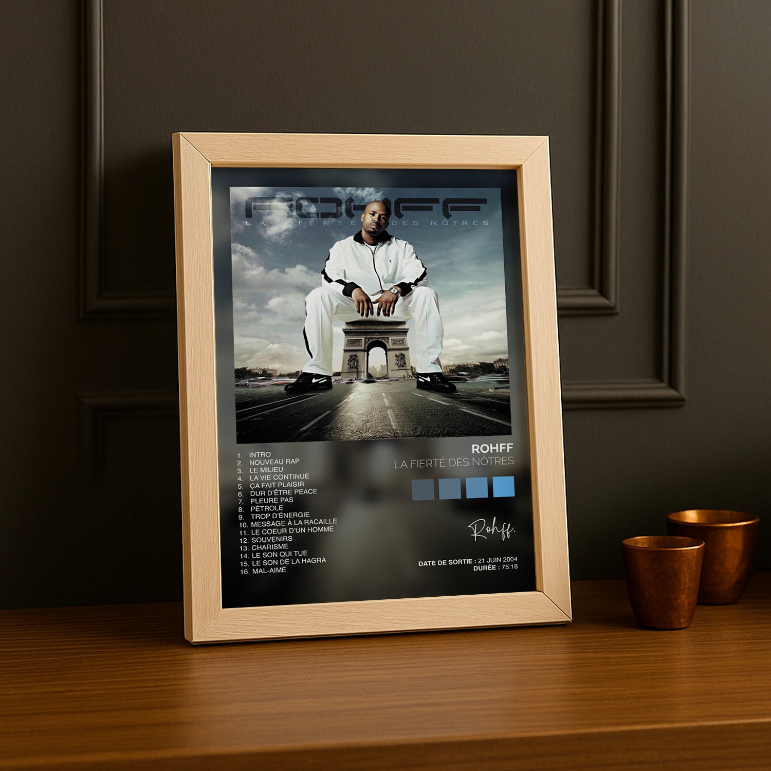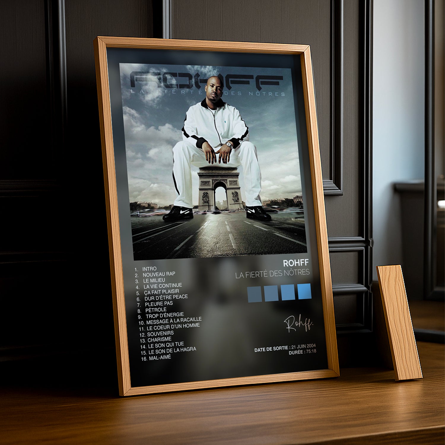 Célébrez l'icône du rap français avec ce cadre photo dédié à Rohff et son album culte "La fierté des nôtres". Un hommage vibrant à l'artiste qui a marqué les générations, parfait pour les fans inconditionnels. Affichage élégant et moderne qui transforme votre espace en galerie personnelle. À accrocher fièrement sur vos murs pour rappeler que la vraie fierté, c'est de rester fidèle à ses racines et à ses passions musicales.