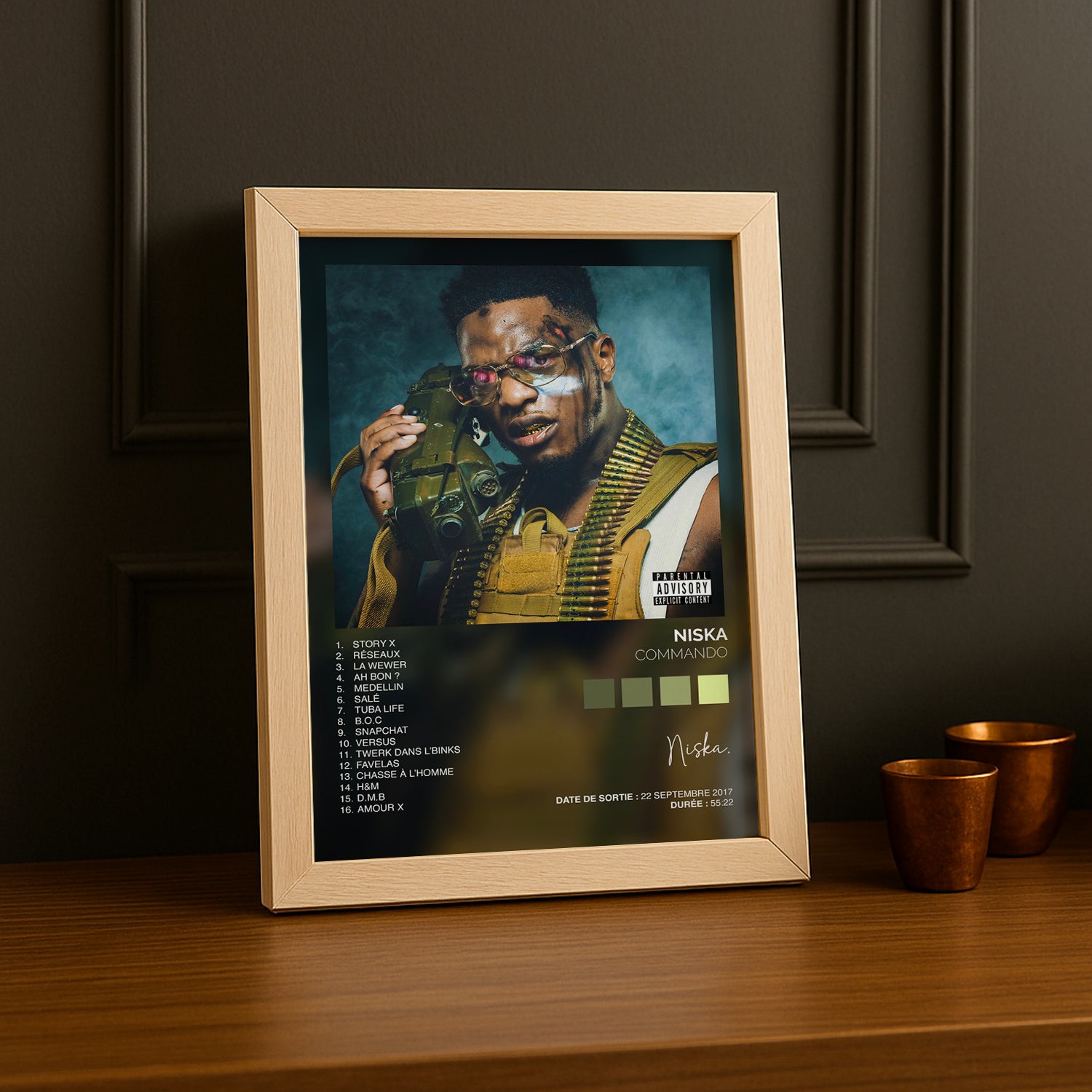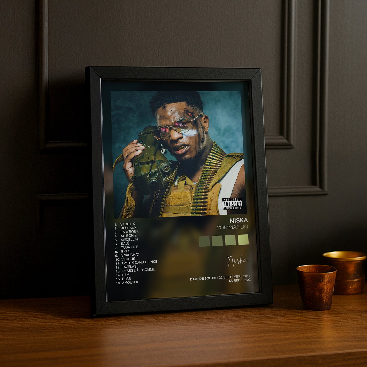 Célébrez l'énergie brute de Commando avec ce cadre photo dédié à Niska ! Parfait pour les fans du rappeur français, ce cadre capture l'essence de l'album culte avec style. Que vous soyez un admirateur de longue date ou un nouveau venu dans l'univers de Niska, ce cadre apporte une touche d'attitude urbaine à votre décoration. Idéal pour afficher votre passion musicale et transformer votre espace en galerie personnelle. Un must-have pour tout vrai fan du Commando !