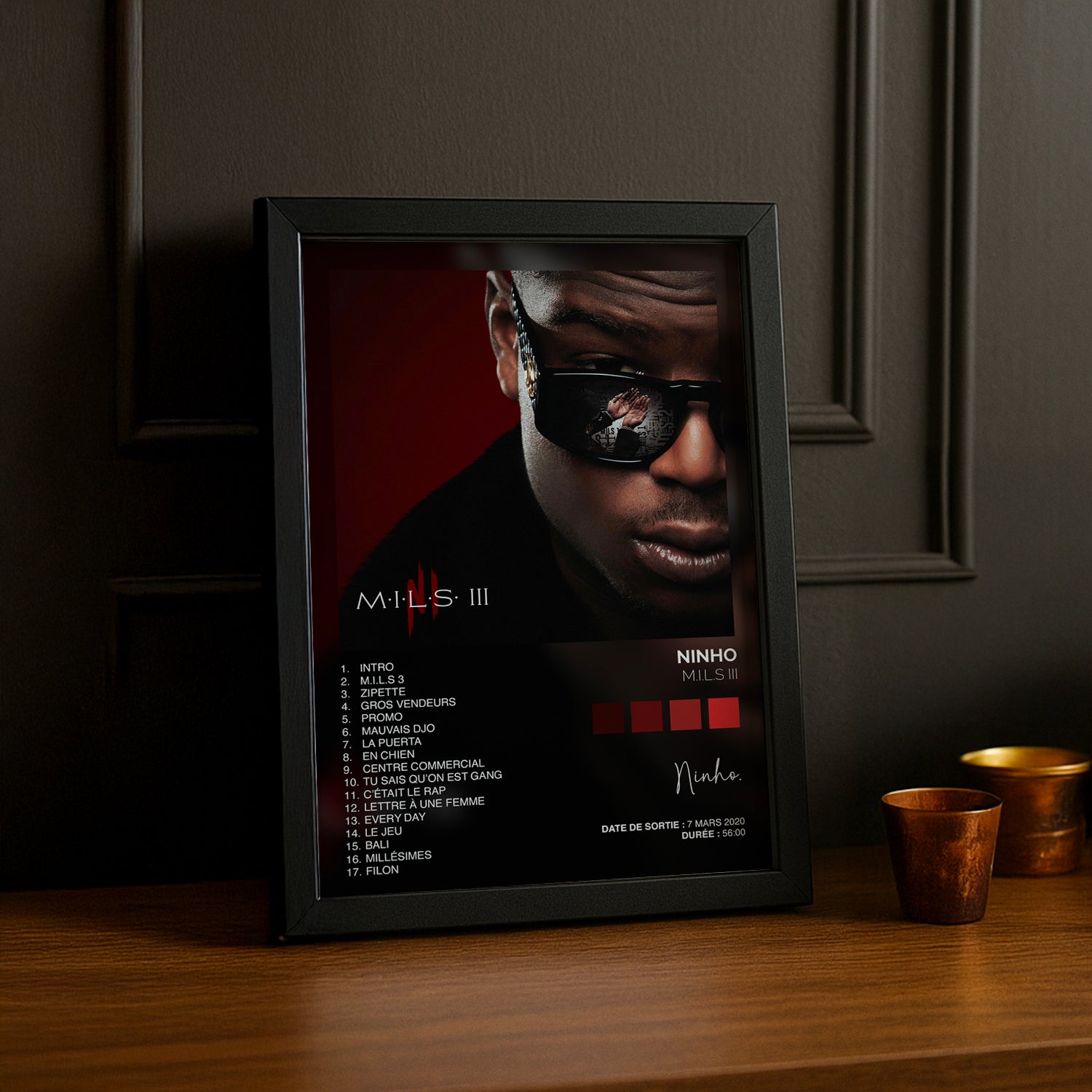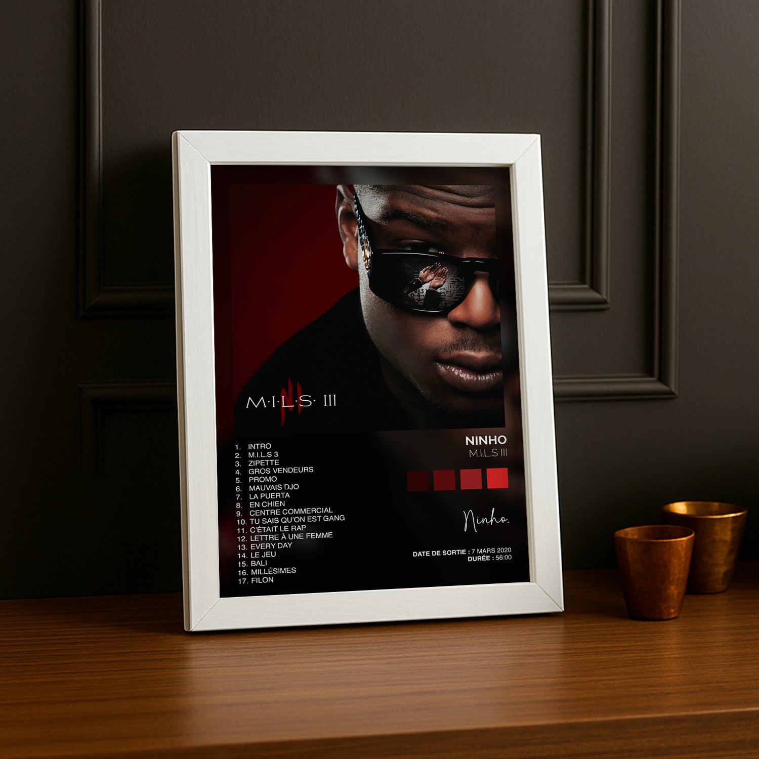 Immortalisez vos moments préférés avec ce cadre photo dédié à l'album culte M.I.L.S 3 de Ninho ! Parfait pour les fans du rappeur, ce cadre allie style urbain et élégance pour sublimer votre décoration intérieure. Que ce soit dans votre chambre, votre salon ou votre bureau, il apporte une touche personnelle et authentique. Un incontournable pour tous les admirateurs de Ninho qui veulent afficher leur passion avec fierté !