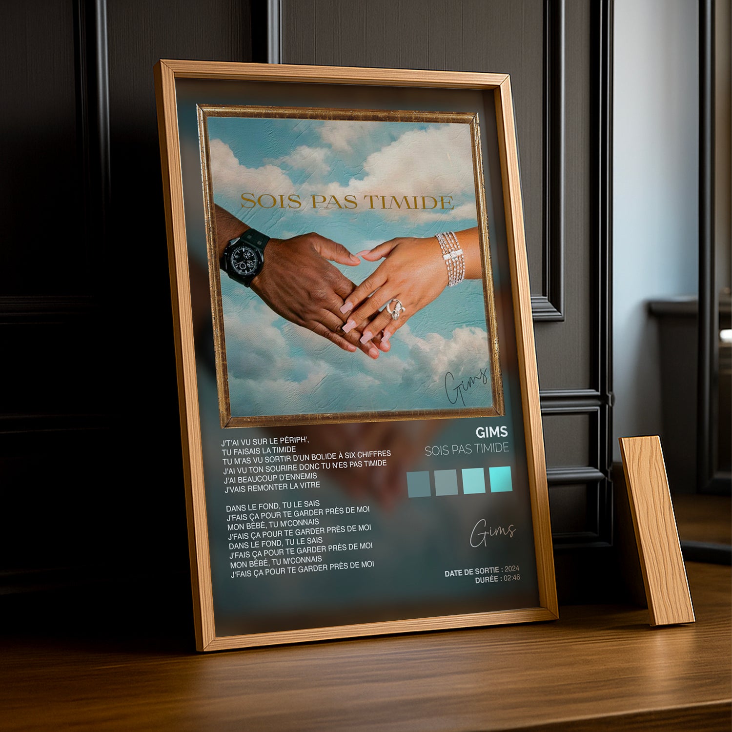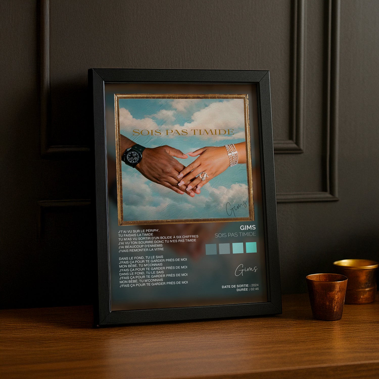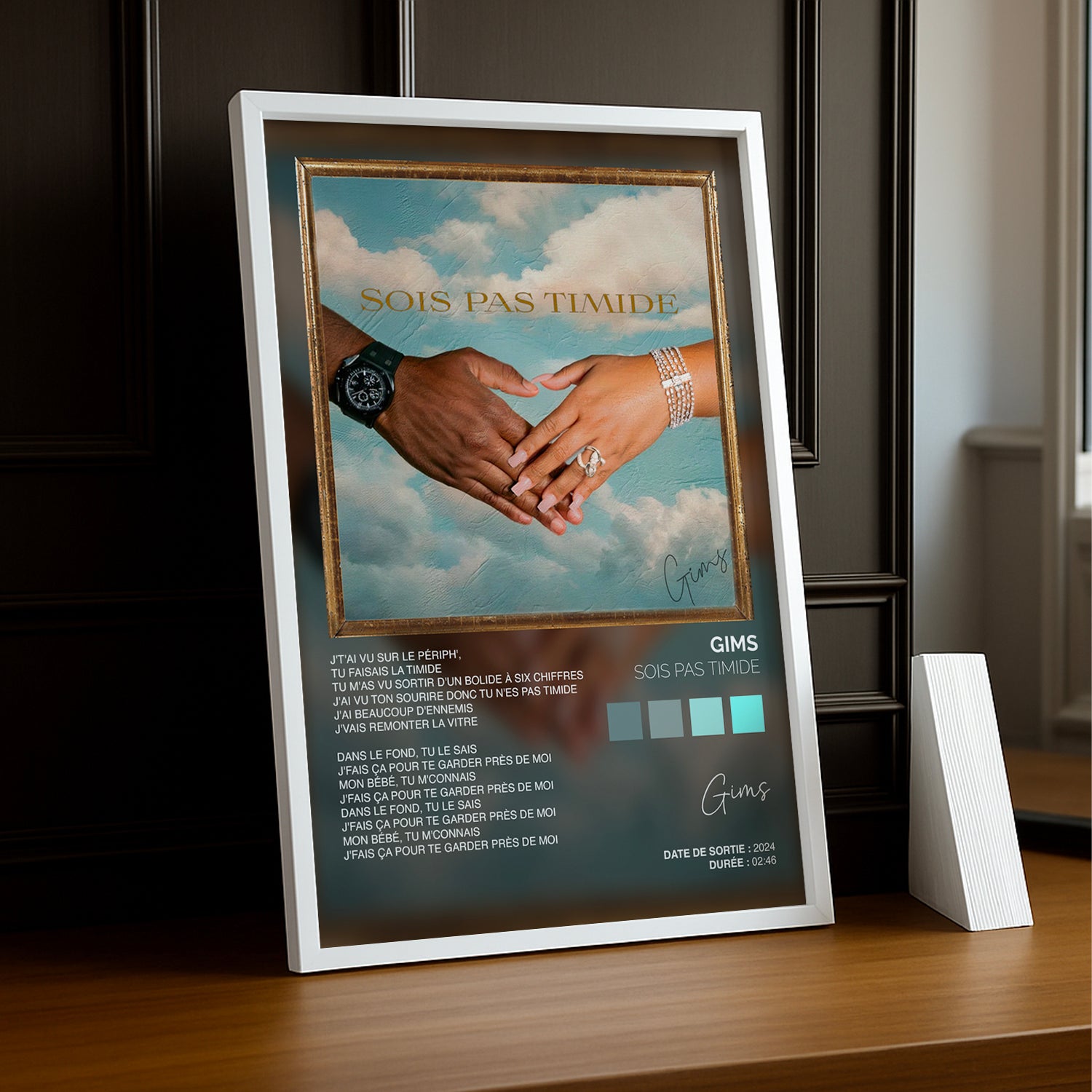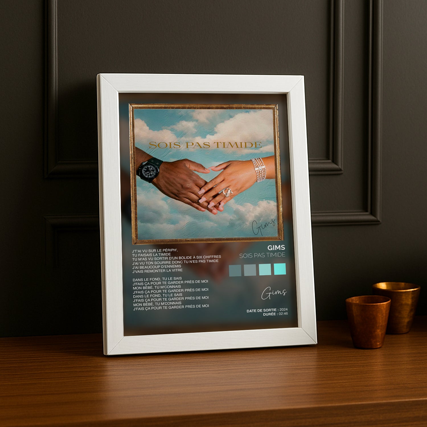 Ajoutez une touche audacieuse et pleine de personnalité à votre déco avec ce cadre photo Titre Musicaux - Sois Pas Timide de Gims. Parfait pour mettre en lumière vos souvenirs tout en insufflant un esprit fun et décomplexé à vos murs. Osez l’originalité avec ce cadre qui invite à la bonne humeur !