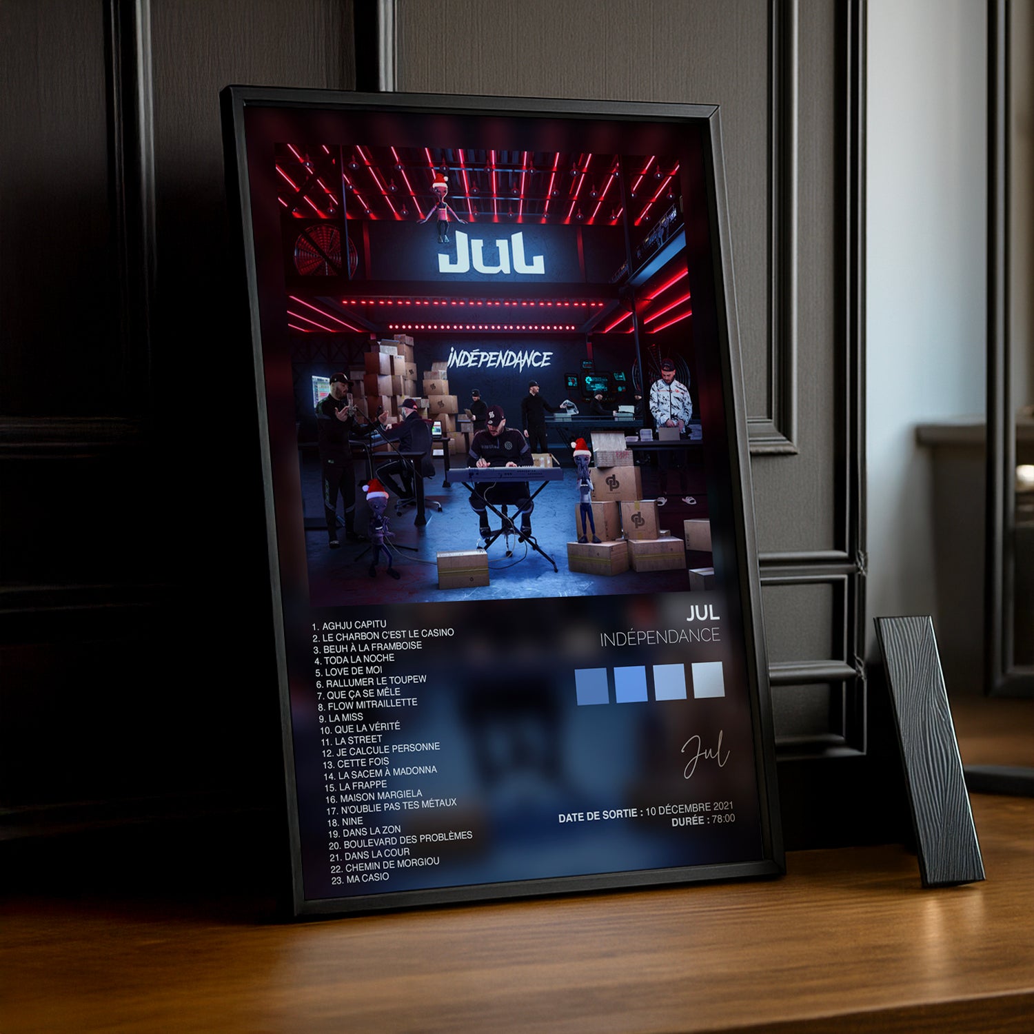Mets en avant la détermination et l’énergie de Jul avec ce poster exclusif de l’album "Indépendance". Fidèle à l’esthétique marseillaise et à l’univers coloré du J, cette affiche est parfaite pour décorer ta chambre, ton studio ou ton espace préféré.