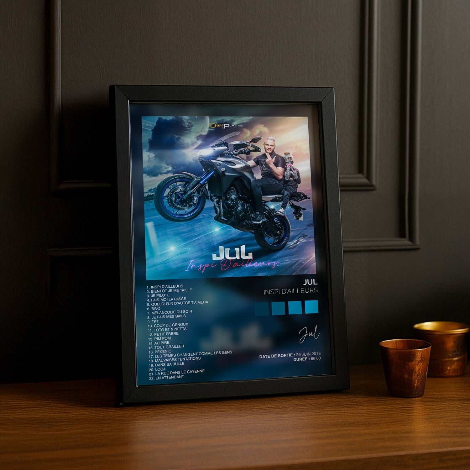 Apporte l’univers solaire et unique de Jul chez toi avec ce poster exclusif de l’album "Inspi d’ailleurs". Fidèle à l’identité marseillaise et colorée du J, cette affiche iconique est parfaite pour une déco moderne et urbaine.