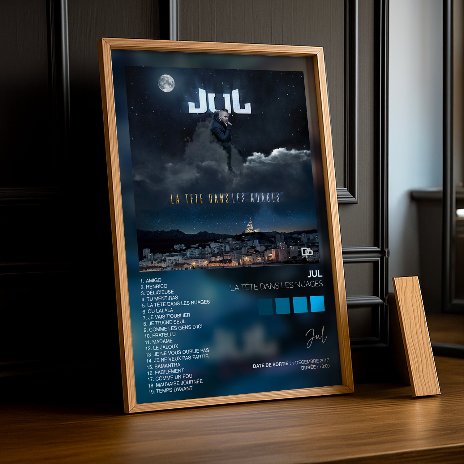 Ramène l’univers marseillais de Jul chez toi avec ce poster exclusif de l’album "La tête dans les nuages". Fidèle à l’énergie et aux couleurs emblématiques du J, cette affiche donnera du caractère à ta décoration, que ce soit pour une chambre, un studio ou un espace créatif.