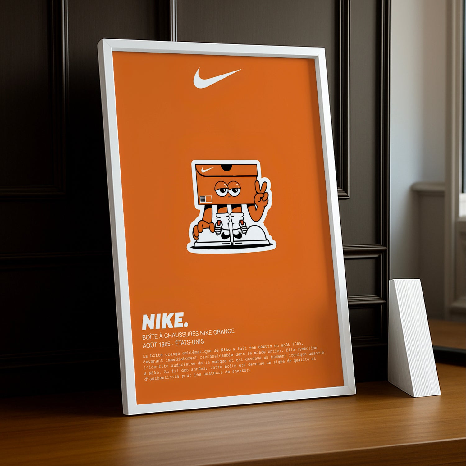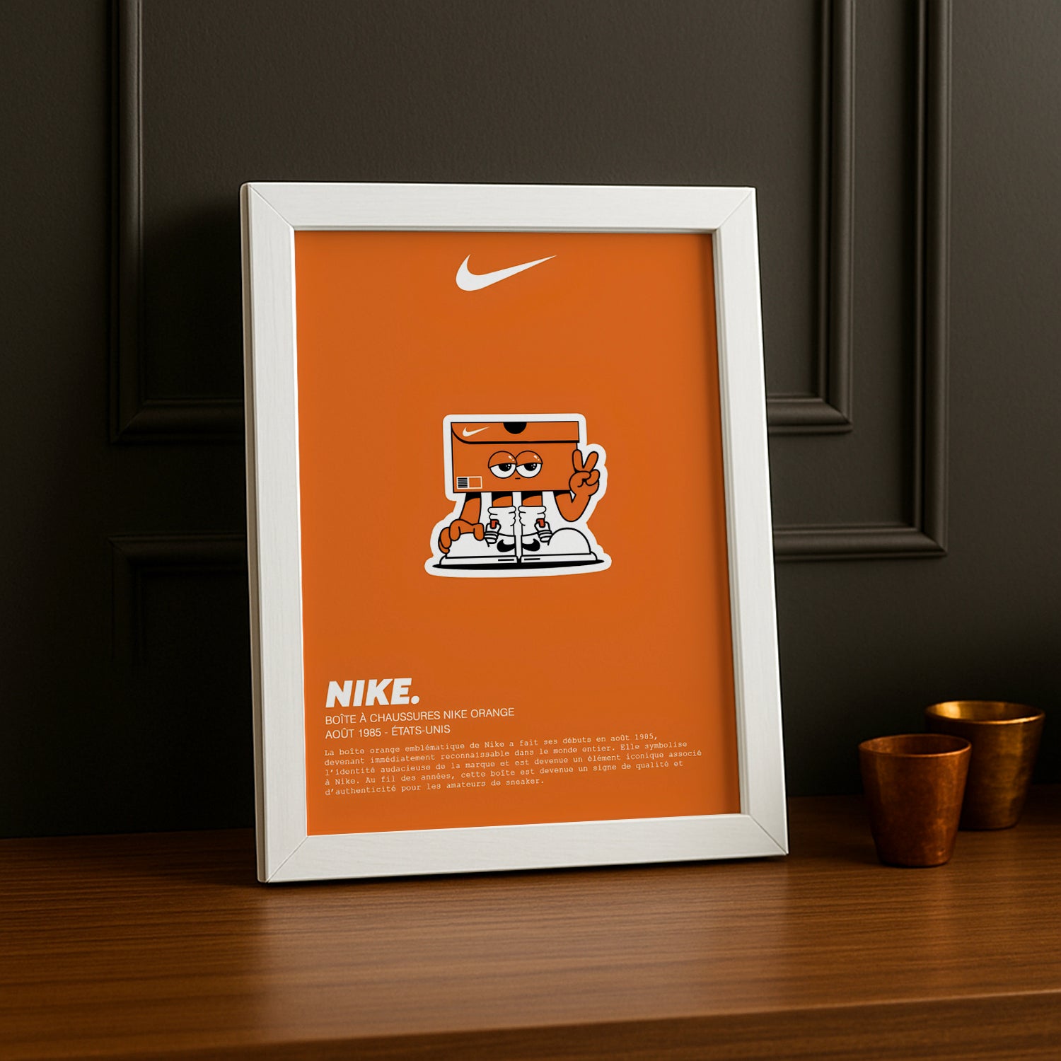 Ce cadre photo met en valeur chaque détail distinctif de la boîte, du logo Nike audacieux à son orange vibrant, capturant l’essence même de l’univers des sneakers. C'est un clin d'œil simple mais efficace à une passion partagée par les amateurs de mode et de street culture.