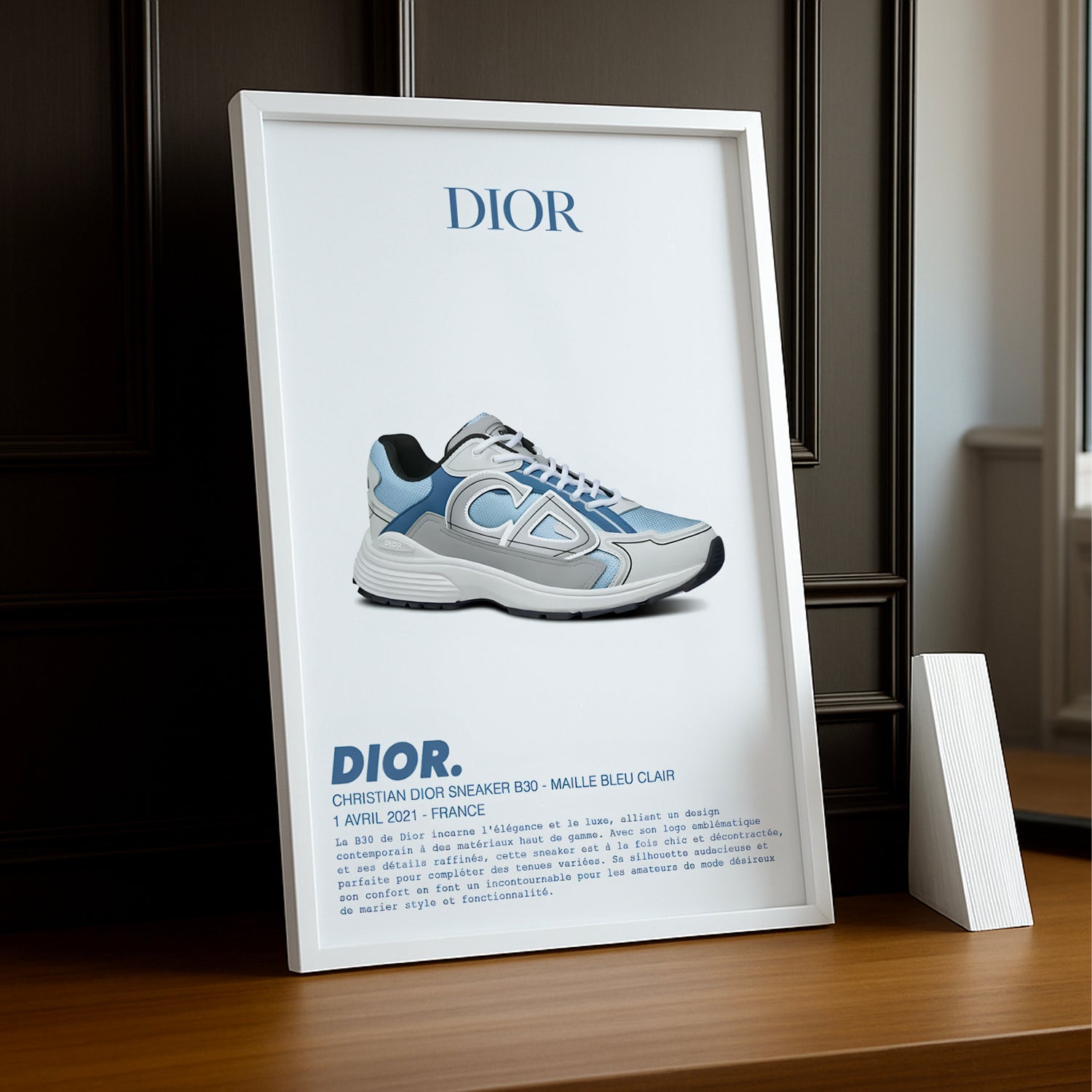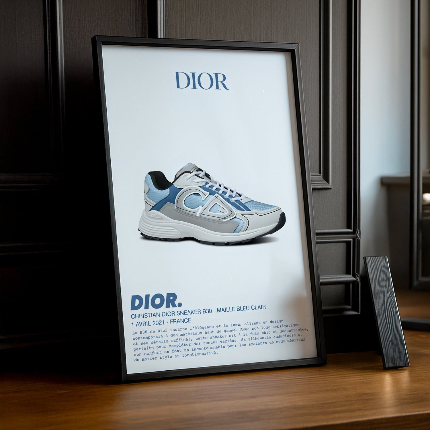 Ajoutez une touche de luxe à votre décoration avec ce cadre photo dédié à la Dior B30 Sneaker. Fusion parfaite entre l'héritage de la maison de couture et l'esthétique contemporaine, la B30 se distingue par ses lignes épurées, ses matériaux de qualité supérieure et son logo emblématique. Avec sa palette de couleurs sophistiquées et ses détails raffinés, cette sneaker est un véritable symbole de l'élégance moderne et du savoir-faire artisanal.