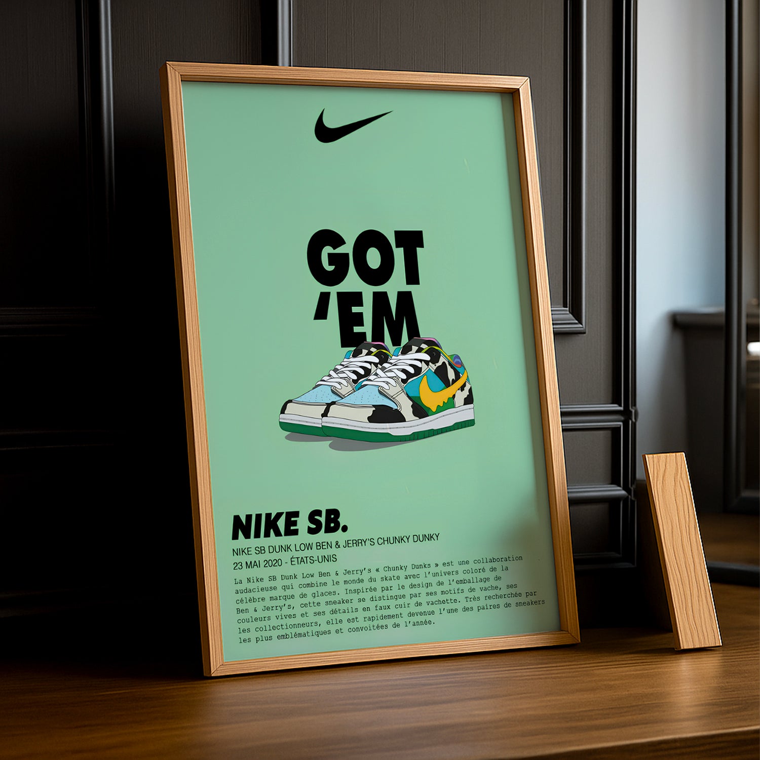 Disponible en plusieurs formats, ce cadre photo est idéal pour apporter une touche de fraîcheur et de créativité à n'importe quel espace. Exposez la Nike SB Dunk Low "Ben & Jerry's Chunky Dunky" sur vos murs et laissez cette pièce audacieuse et colorée transformer votre décor avec style et bonne humeur.