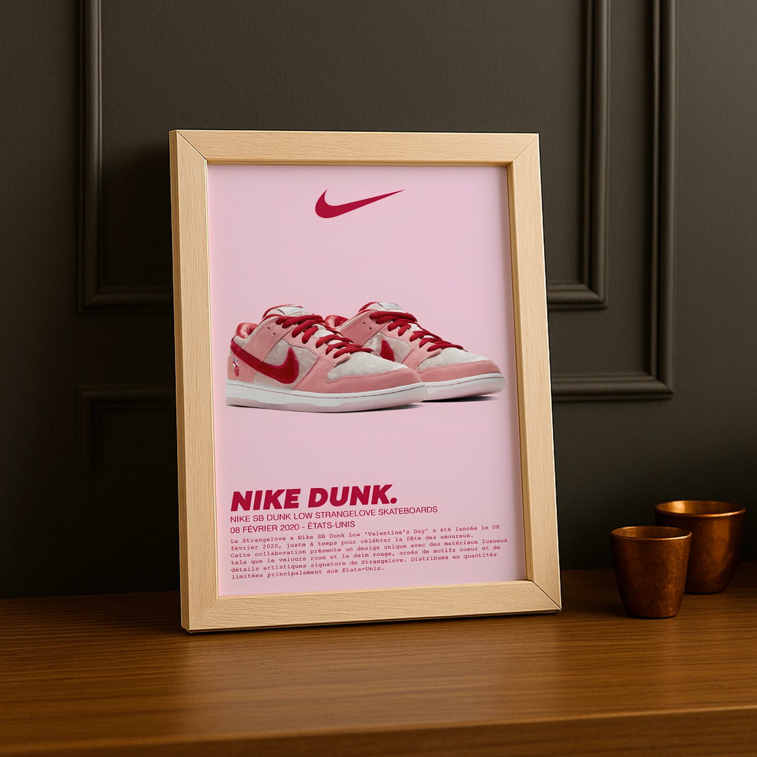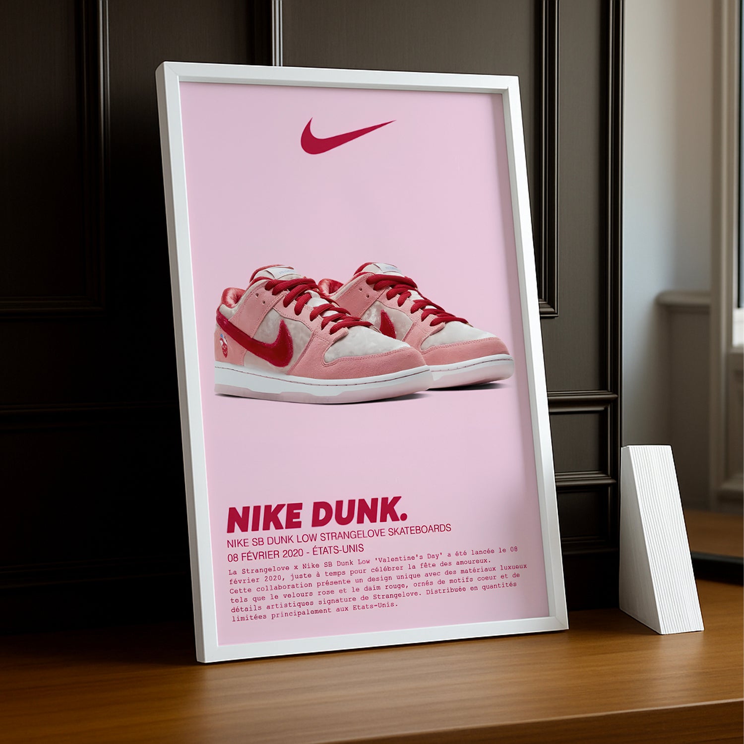 Capturez l'essence de la Nike SB Dunk Low "Strangelove Skateboards" avec ce cadre photo exclusif, mettant en lumière l'une des collaborations les plus convoitées du monde des sneakers. Avec ses nuances de rose, de rouge et de blanc, ce modèle emblématique célèbre l'amour et le style à travers un design audacieux et unique, inspiré par l'art de Strangelove Skateboards.
