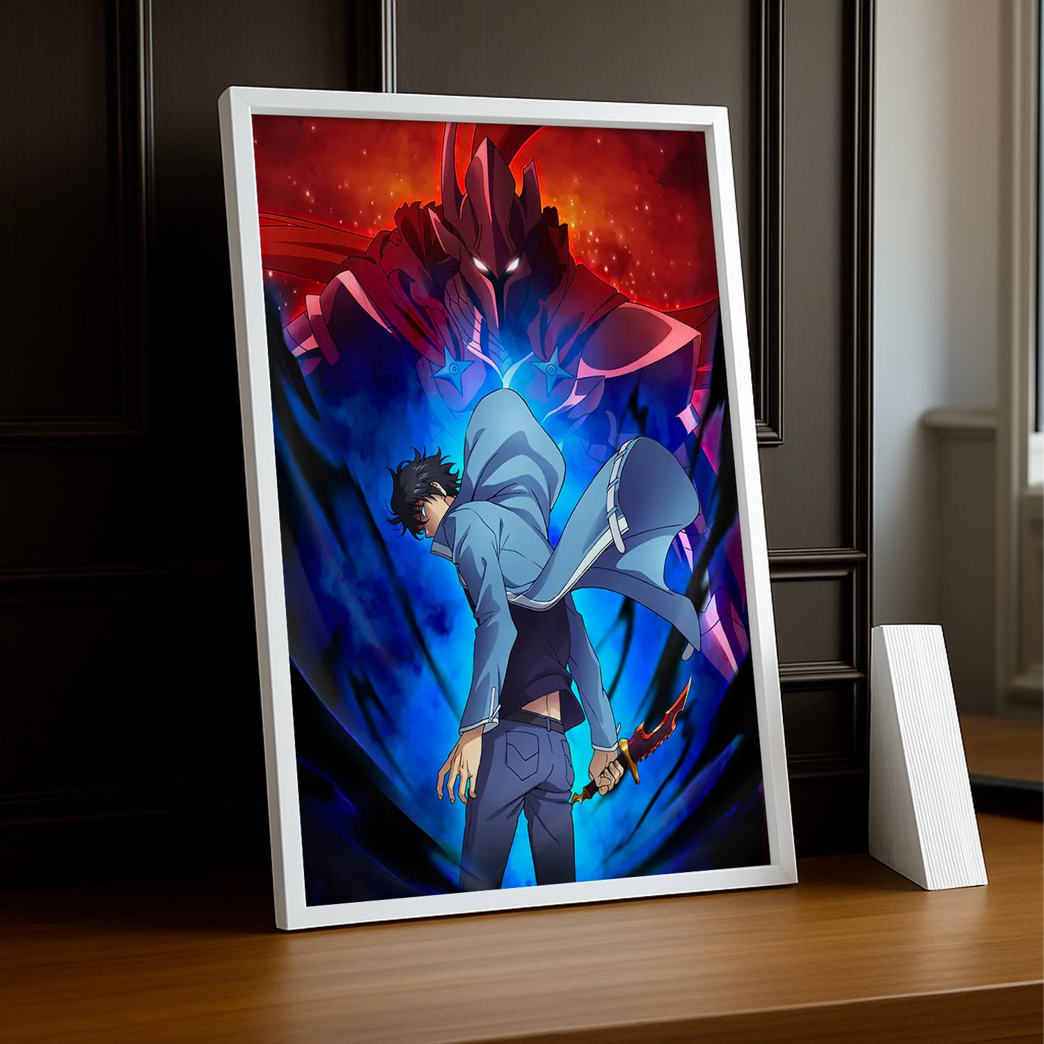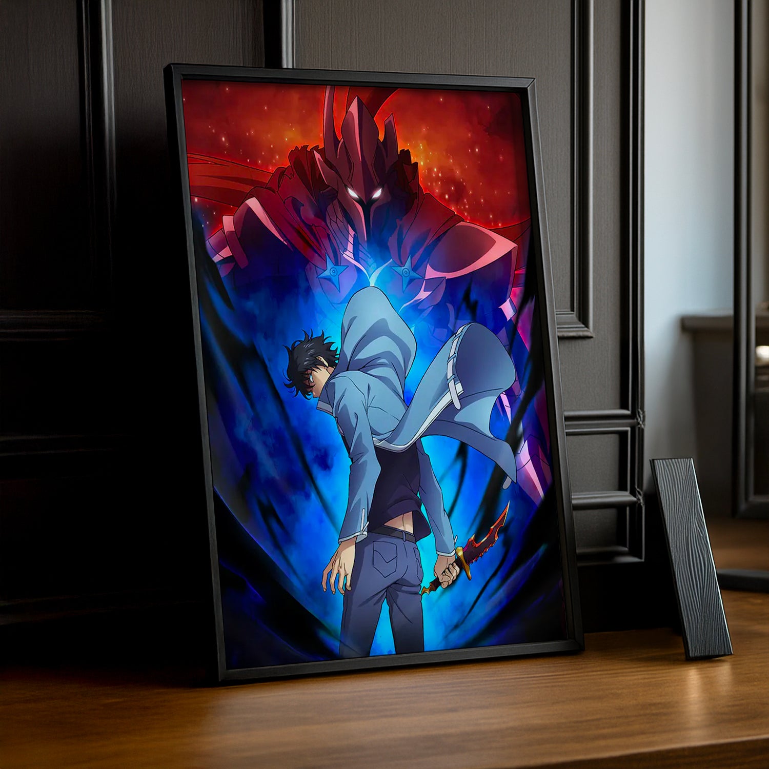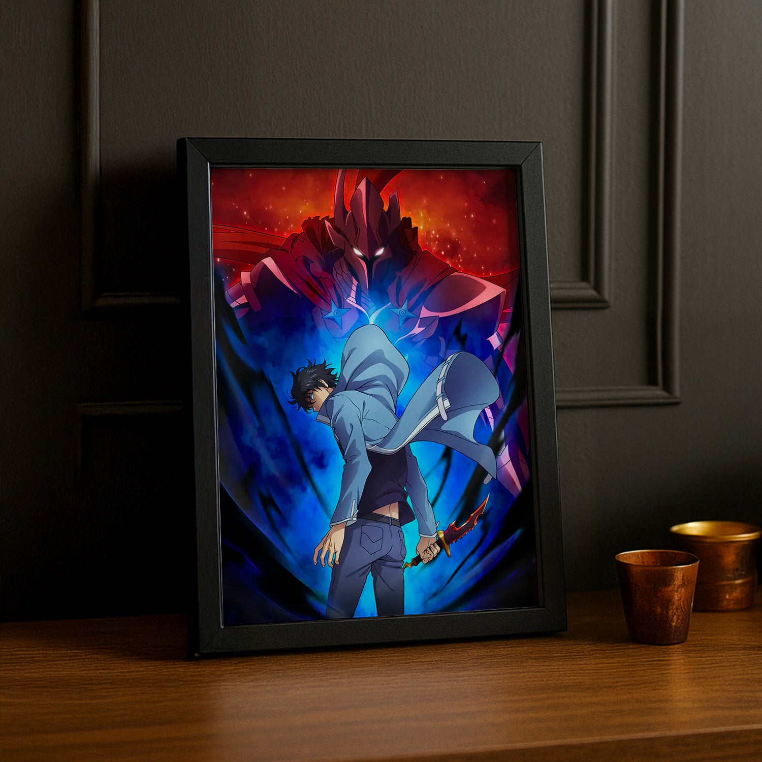 Célébrez le duo légendaire avec ce cadre photo Jinwoo and Igris Ascendant ! Immortalisez la connexion épique entre le maître et son fidèle serviteur dans leur apothéose de puissance. Ce cadre capture la complicité et la force brute de ces deux personnages emblématiques, parfait pour les fans qui adorent leur dynamique captivante. Installez-le fièrement dans votre espace pour montrer votre admiration pour cette alliance indestructible. Un choix idéal pour transformer votre décoration en véritable hommage à Solo Leveling et à ses personnages les plus mémorables !