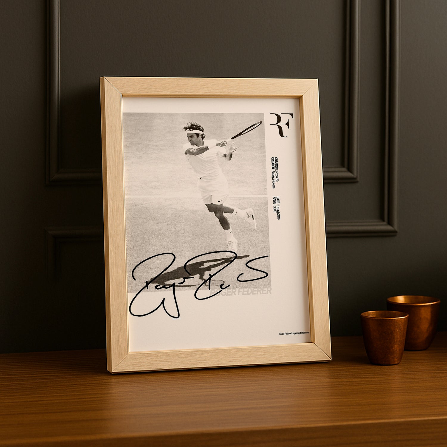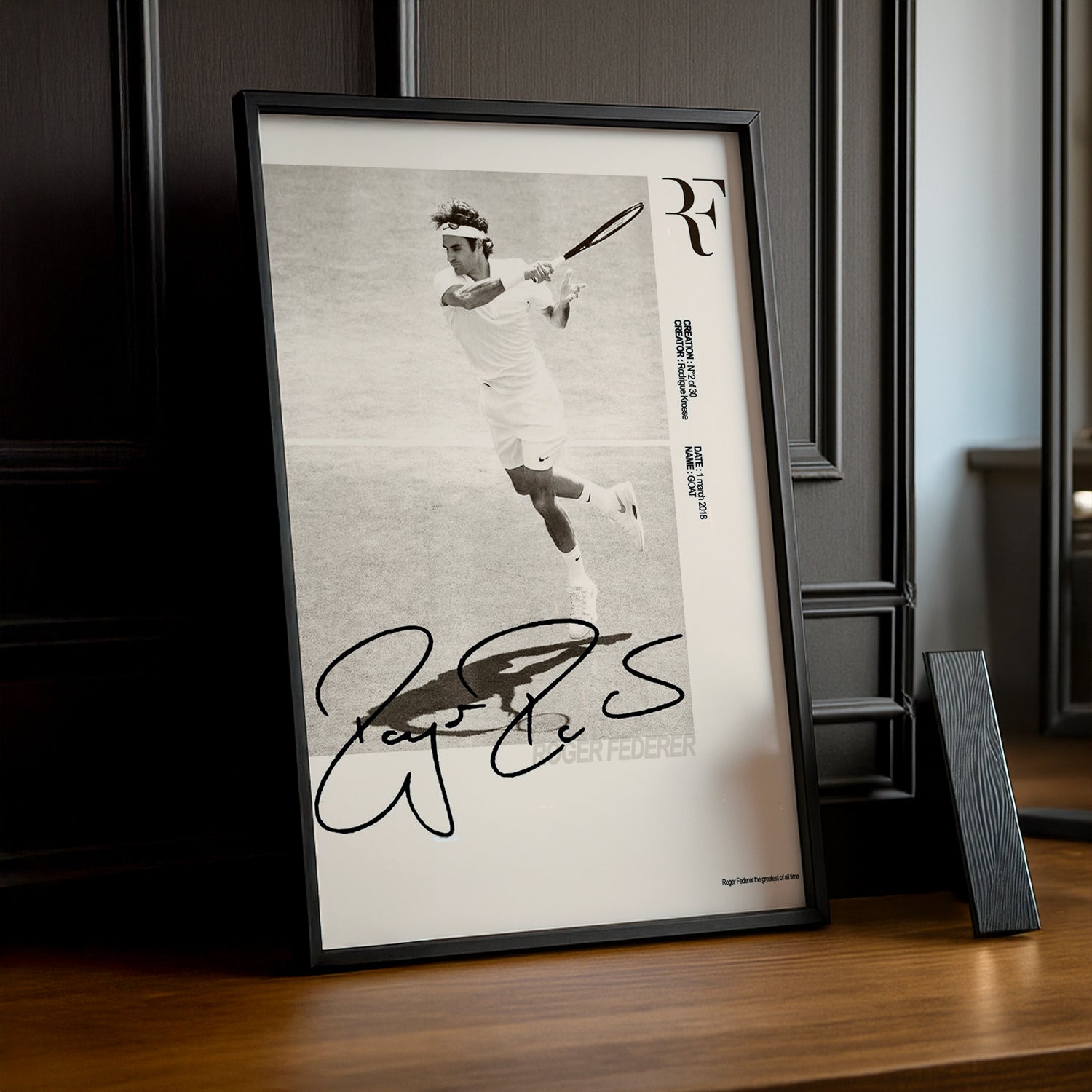 Portez les initiales de la légende ! Ce poster photo célèbre Roger Federer à travers ses initiales RF, symbole de perfection et d'élégance intemporelle. Parfait pour les connaisseurs qui reconnaissent immédiatement ce code tennistique. Transformez votre intérieur en galerie minimaliste dédiée au maestro. Idéal pour créer une ambiance sophistiquée et inspirante. Un poster qui capture l'essence d'une icône en trois lettres !