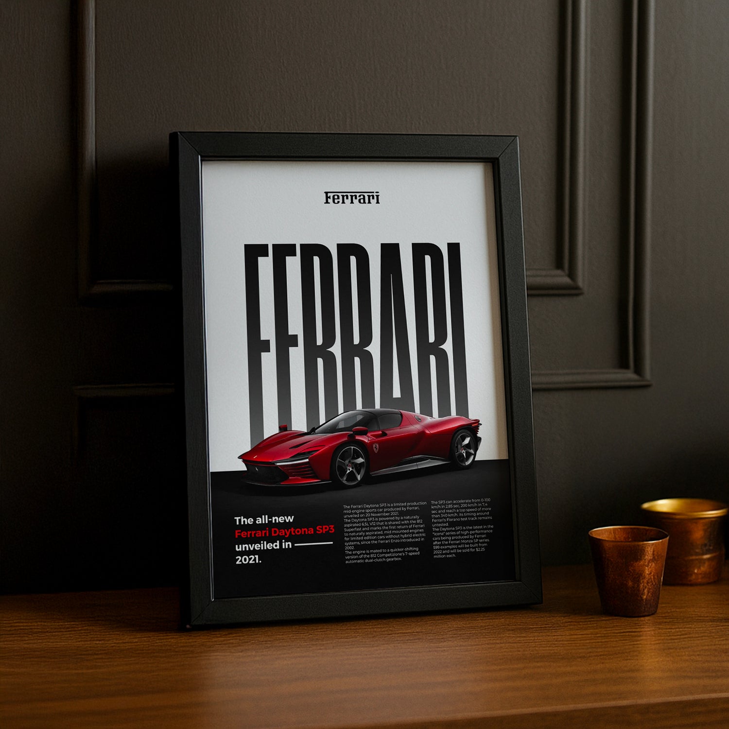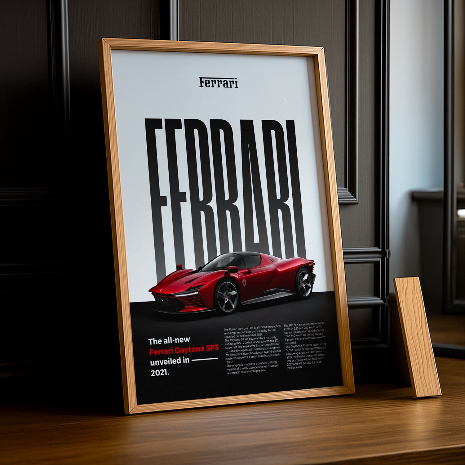 Ajoutez une touche d’audace à votre déco avec ce poster de la Ferrari Daytona SP3, un chef-d’œuvre de design et de performance. Parfait pour tous les amateurs de sensations fortes, il capture l’esprit d’une légende sur quatre roues, prêt à enflammer vos murs avec style et passion. Une pièce incontournable pour les rêveurs de vitesse et d’élégance !