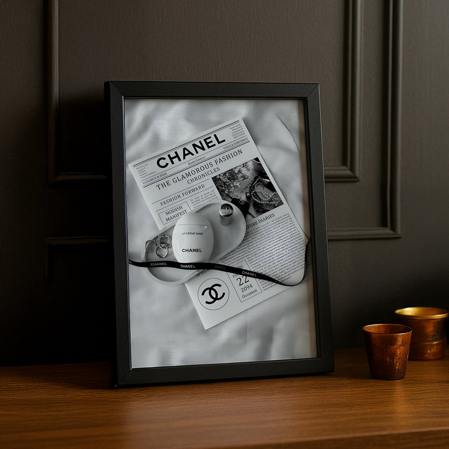 Transformez vos souvenirs en œuvre d'art avec ce cadre photo Chanel inspiré des journaux iconiques. Son design élégant mêle sophistication parisienne et charme rétro, parfait pour afficher vos photos préférées avec style. Que ce soit sur une étagère, un bureau ou un mur, ce cadre ajoute une touche de glamour intemporel à votre décoration. Un accessoire chic qui dit : « Oui, j'ai du goût ! »