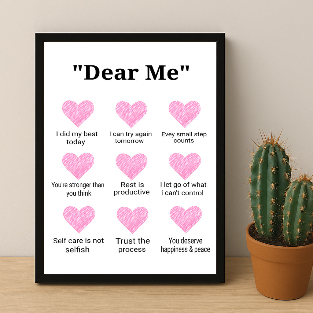 Offrez-vous un clin d'œil complice avec ce cadre photo "Dear Me". Idéal pour se rappeler avec humour de prendre soin de soi tout en gardant le sourire, il ajoutera une touche légère et personnelle à votre décoration.