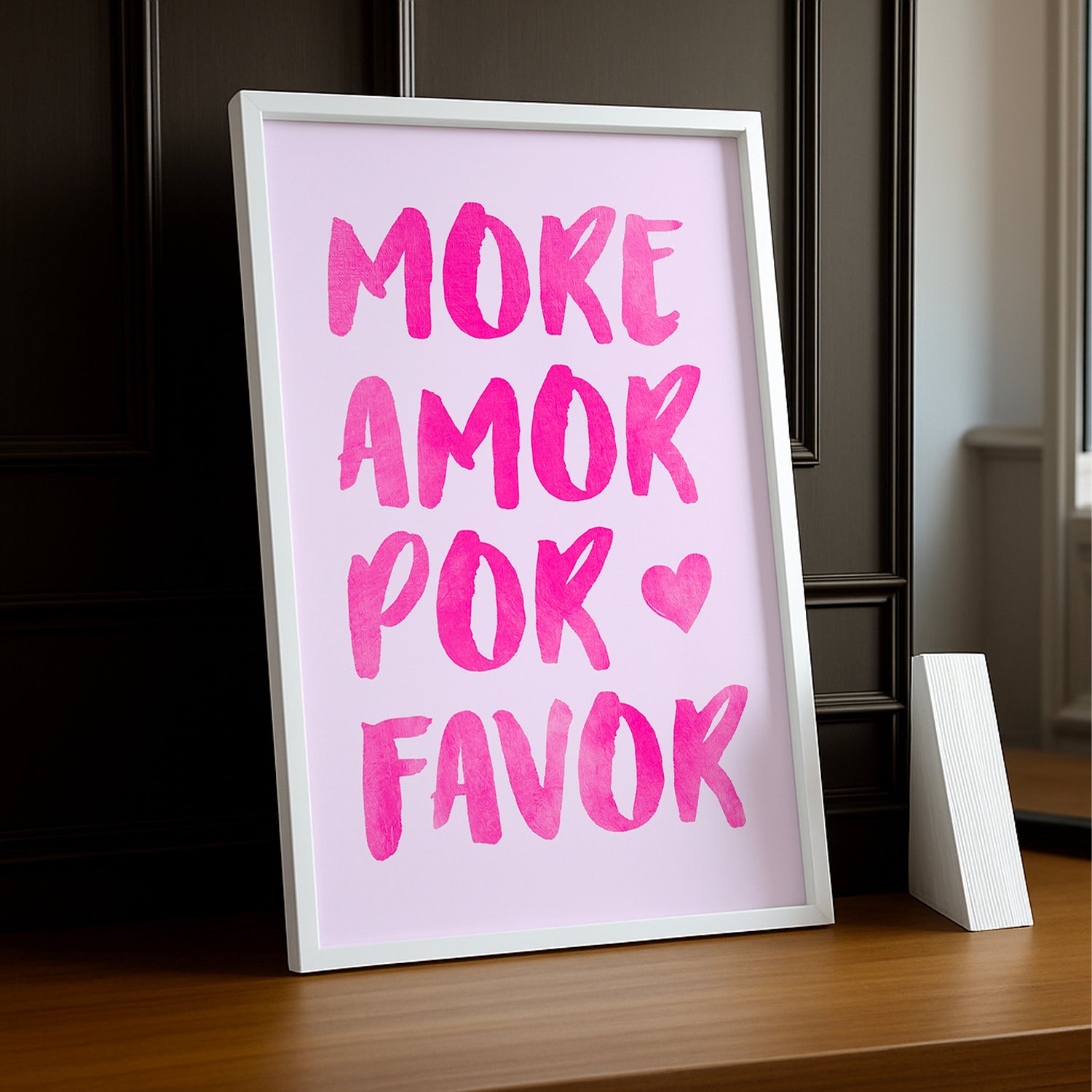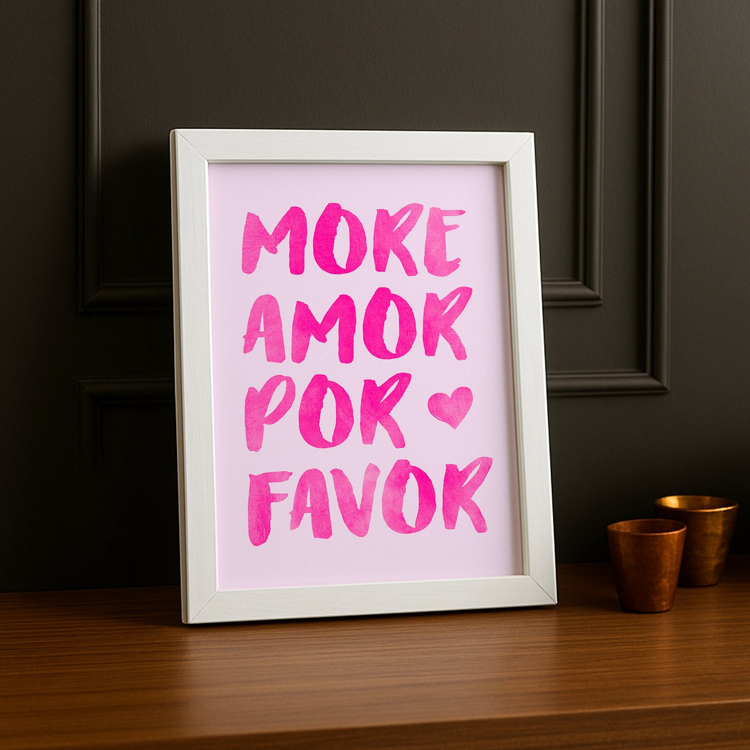 Cadre romantique en rose avec la citation "More Amor Por Favor" - une déclaration espiègle d'amour et de tendresse ! Ce cadre mélange l'espagnol avec humour pour exprimer un désir simple : plus d'amour, s'il vous plaît. Avec sa teinte rose douce et son message chaleureux, il crée une atmosphère romantique et légère. Idéal pour une chambre de couple, un salon bohème ou comme cadeau pour quelqu'un de spécial. Un décor qui célèbre l'amour avec style, poésie et un clin d'œil complice !