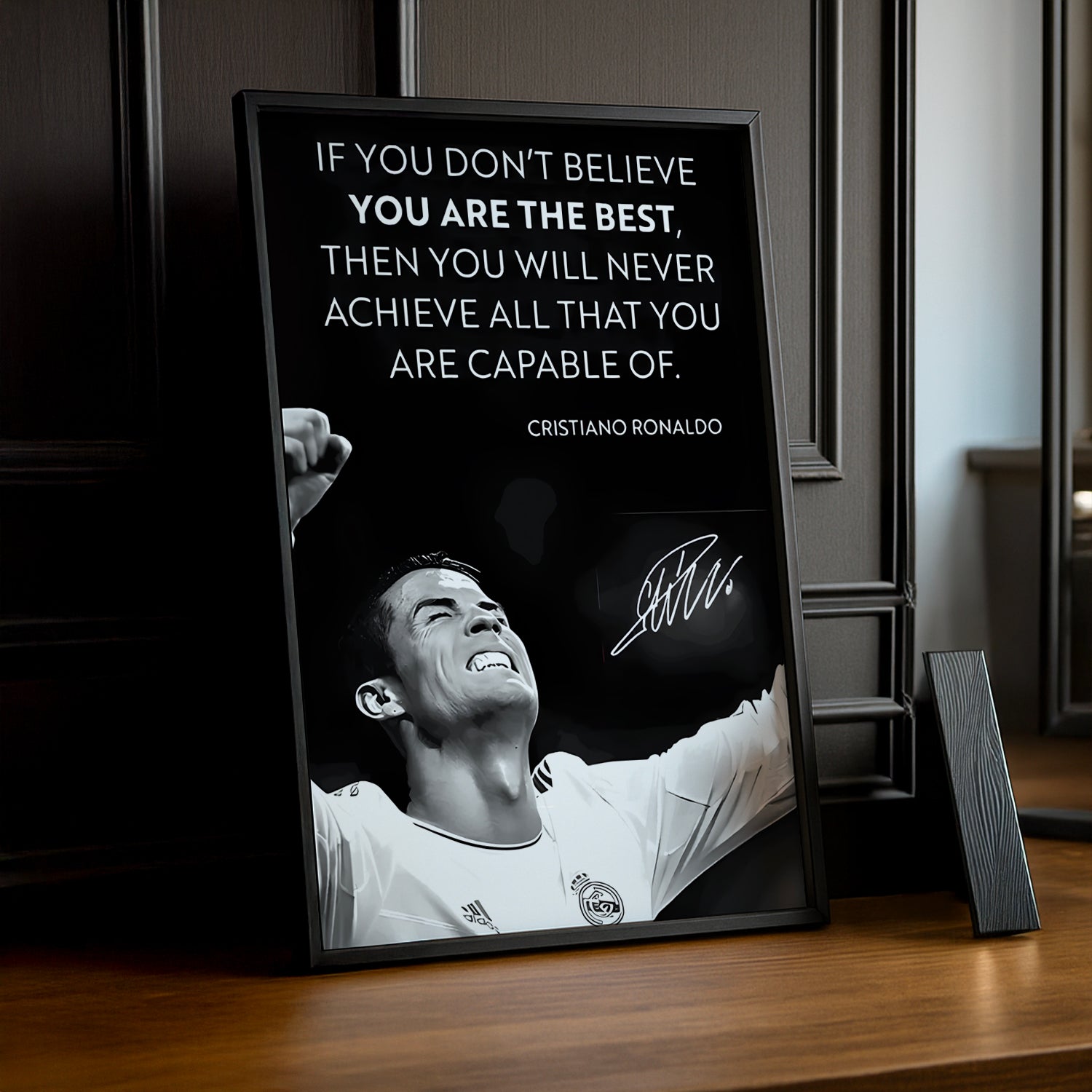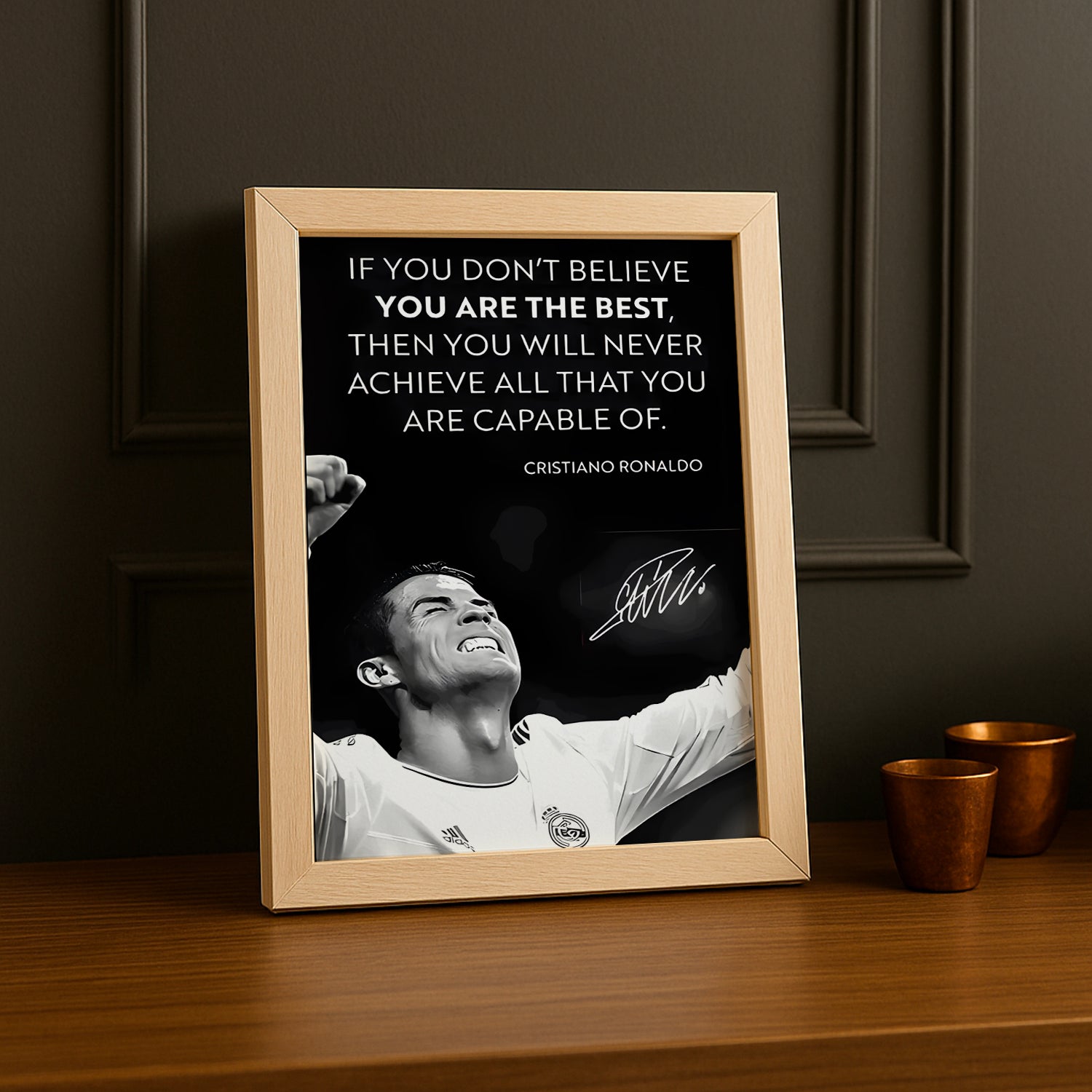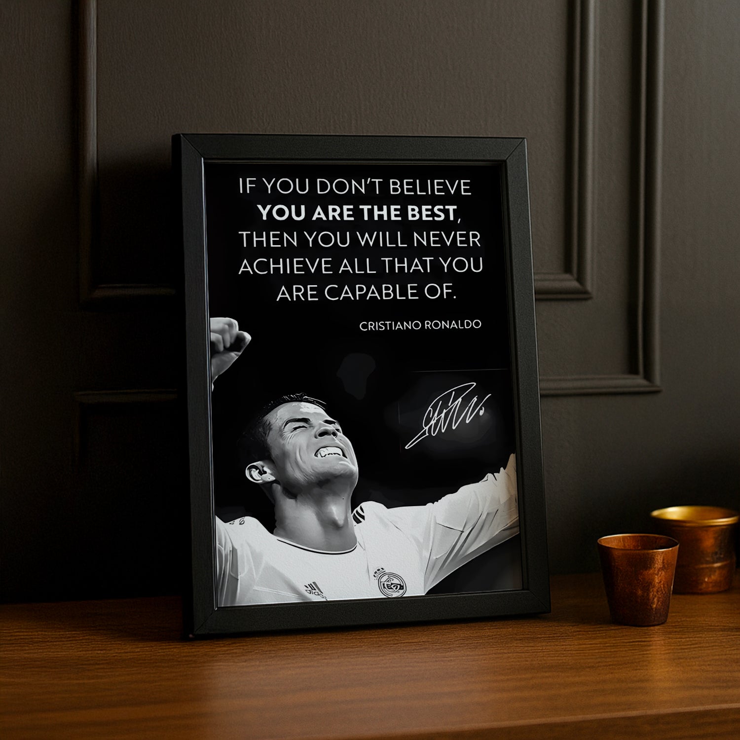 Un Chef-d'Œuvre Pour les Fans de Football et de Champions Inégalés Affichez votre admiration pour Cristiano Ronaldo, l'un des meilleurs joueurs de l'histoire du football, avec ce cadre photo exceptionnel ! Imprimé en haute définition, chaque détail capture sa puissance, sa détermination et son incroyable palmarès, dont 5 Ballons d'Or, des titres avec Manchester United, Real Madrid, Juventus, et ses exploits inoubliables avec l'équipe nationale du Portugal. Parfait pour ajouter une touche de légende et de motivation à votre salon, bureau ou espace de jeu.
