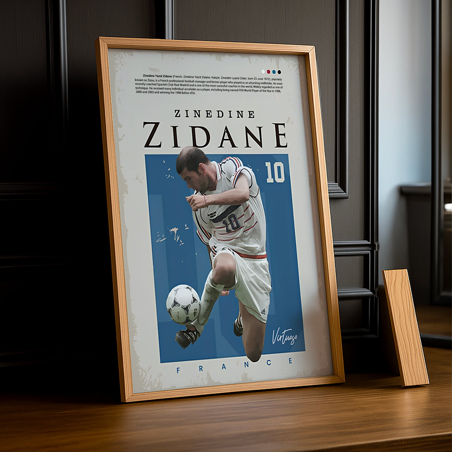 Un Chef-d'Œuvre Pour les Fans de Football et d'Excellence Technique Affichez votre admiration pour Zinédine Zidane, l’un des plus grands joueurs de l’histoire du football, avec ce cadre photo exceptionnel ! Imprimé en haute définition, chaque détail capture son élégance incomparable, sa technique parfaite et ses moments magiques, notamment sa victoire en Coupe du Monde 1998 et sa majestueuse carrière au Real Madrid. Parfait pour ajouter une touche de classe et de génie au cœur de votre salon, bureau ou espace de jeu.