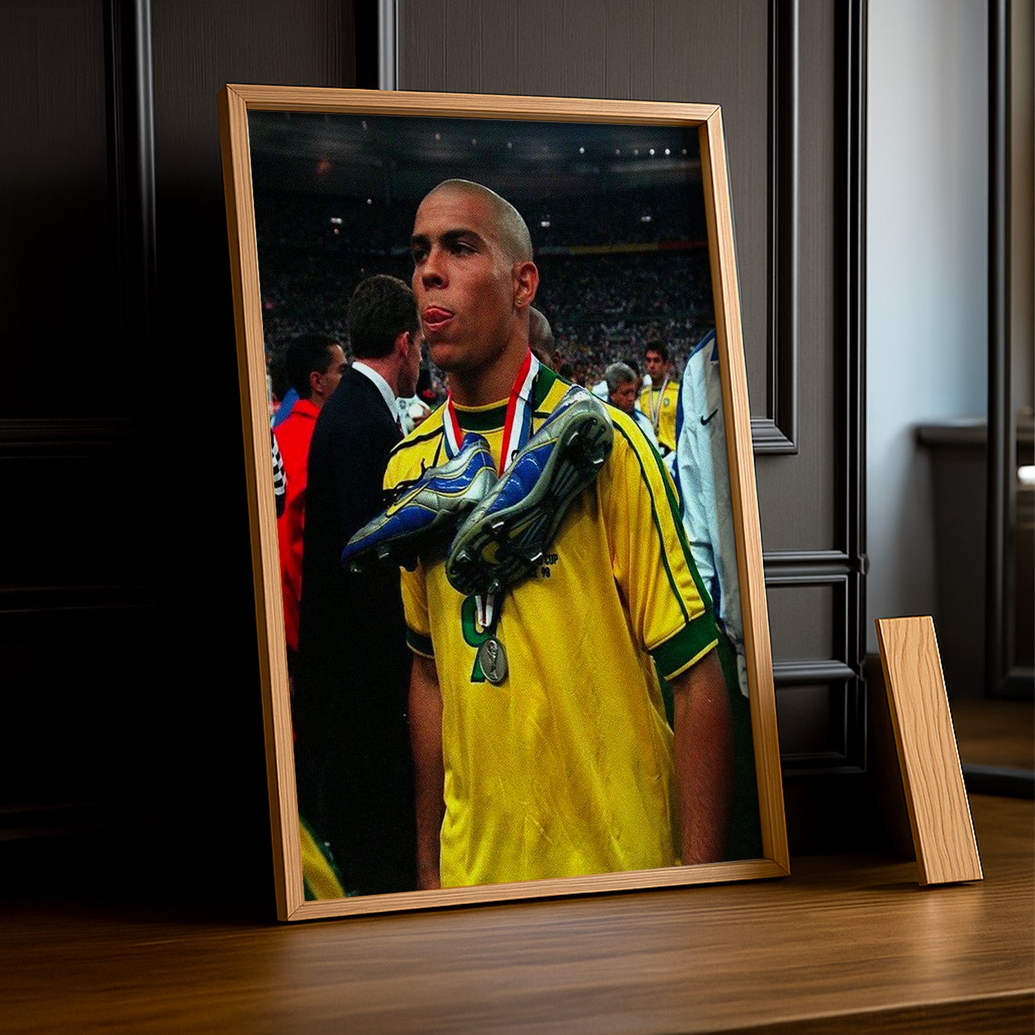 Faites vibrer votre mur avec ce poster encadré de Ronaldo, le mythique numéro 9 du Brésil ! Parfait pour les fans qui aiment les légendes du foot, ce poster apporte une explosion d’énergie et de style brésilien à votre déco, pour un clin d’œil joyeux au roi de la surface !