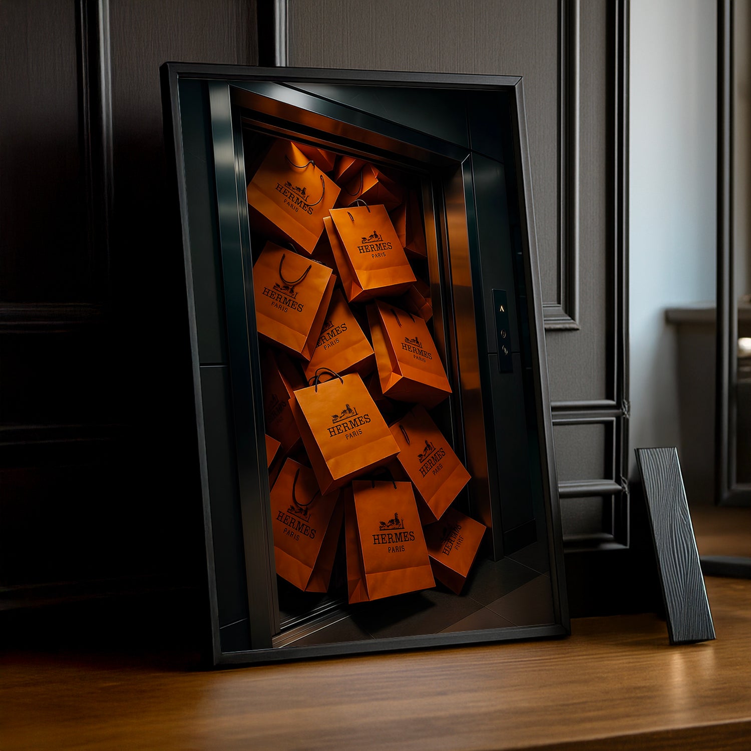 Montez en grade avec ce cadre photo Hermès Ascenseur Sac, où l'univers des accessoires de prestige prend vie sur vos murs. Inspiré par l'iconique savoir-faire de la maison, ce cadre transforme vos souvenirs en véritable déclaration de style. Parfait pour encadrer une photo de voyage, un portrait élégant ou un instant mémorable, il ajoute une dimension luxueuse à votre décoration intérieure. Son design original et son authenticité signature en font un accessoire qui respire le prestige français. Un objet de collection qui illumine votre espace avec sophistication et une touche d'humour raffiné.