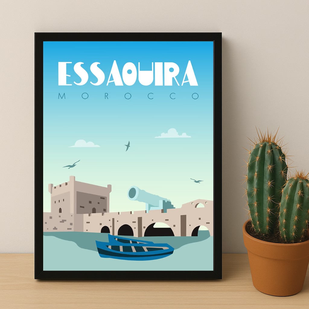 Apportez la brise marine d’Essaouira à votre déco avec ce poster plein de fraîcheur et de couleurs ! Parfait pour insuffler une ambiance joyeuse et détendue, il invite à l’évasion vers cette charmante ville côtière marocaine. Un clin d’œil ludique pour les amoureux du soleil et de l’aventure.